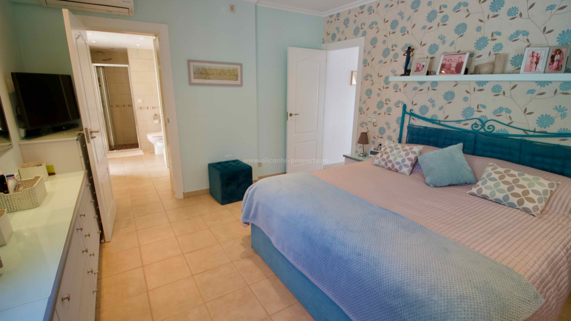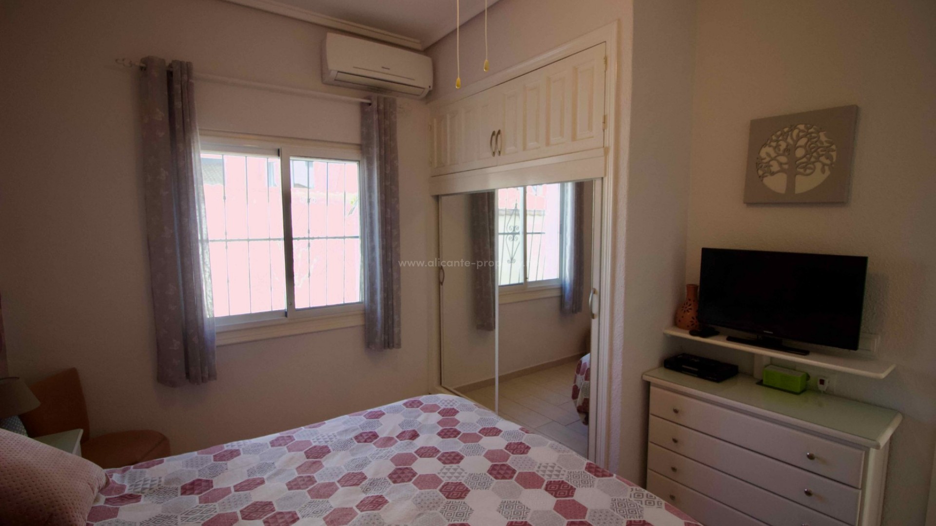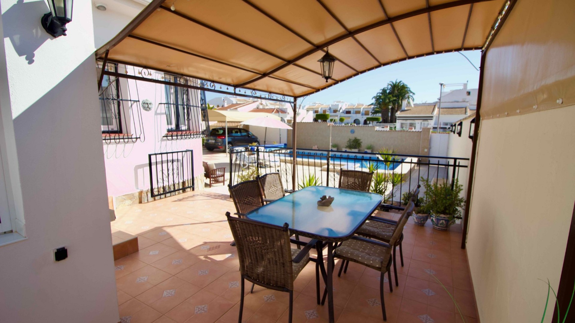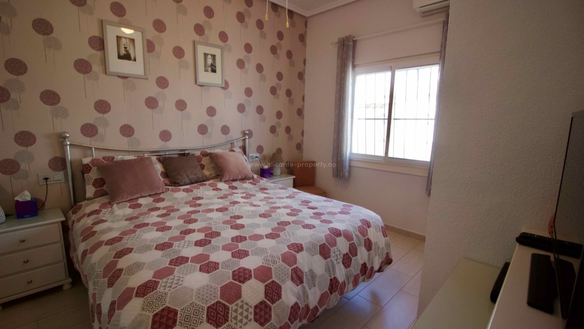 Denne sjarmerende, perfekt vedlikeholdte, frittliggende villaen med tre soverom og to bad ligger i det ettertraktede Pueblo Bravo-området i Ciudad Quesada på den sørlige Costa Blanca. Et velkjent supermarked, barer, restauranter og en privatskole ligger innen gangavstand. Fasilitetene til Doña Pepa, inkludert et apotek, barer, restauranter, et medisinsk senter, en språkskole og det vakre spahotellet La Laguna, ligger også i nærheten. Bare en 5-minutters kjøretur unna ligger den populære hovedgaten i Quesada med en rekke restauranter, barer, supermarkeder, banker, en bensinstasjon, en bowlinghall og to handlegater. Den vakre La Marquesa golfbanen, med et velkjent supermarked og diverse barer og restauranter, er også lett tilgjengelig. Den herlige Recorral naturpark, med sine innsjøer og piknikområder, og Rojales familiebadeland ligger også en kort kjøretur unna. De nærmeste fantastiske sandstrendene ligger bare en 10-minutters kjøretur unna i Guardamar del Segura. Denne attraktive villaen i middelhavsstil har blitt utmerket vedlikeholdt og forbedret av de nåværende eierne, og tilbyr ideelt sett alle rom i én etasje. Innvendig finner du: en vakker glassterrasse som gir direkte tilgang til bassenget og hagen, som for tiden brukes som spiseplass; en romslig og innbydende stue med peis og trippelglass; et velproporsjonert, halvåpent kjøkken med frokostbar; to gjesterom, begge dobbeltrom med innebygde garderober; et moderne familiebad med badekar; og et imponerende hovedsoverom som er større enn gjennomsnittet med innebygde garderober og god lagringsplass, som også har et eget dusjrom og en ytterdør. Eiendommen ligger på en stor, privat, inngjerdet tomt i utmerket stand og krever minimalt vedlikehold. Den har et vakkert, soloppvarmet svømmebasseng med god plass til solsenger, en overbygd parkeringsplass med elektrisk port, fine overbygde stue-/spiseområder og diverse lagringsplasser på sidene og baksiden av huset. Det er også et privat, solfylt solarium på taket hvor du kan nyte den spanske solen og en vakker utsikt over omgivelsene. Boligen er også utstyrt med klimaanlegg og takvifter i alle rom, noe som gjør det komfortabelt hele året. Andre fordeler og bemerkelsesverdige funksjoner inkluderer: 14 solcellepaneler for høyere energieffektivitet, insektnett og UV-filtre på alle vinduer, en fjernstyrt ringeklokke, et alarmsystem og fjernstyrt bassengbelysning. Prisen for de vakre møblene er omsettelig og avhenger av budet som mottas.