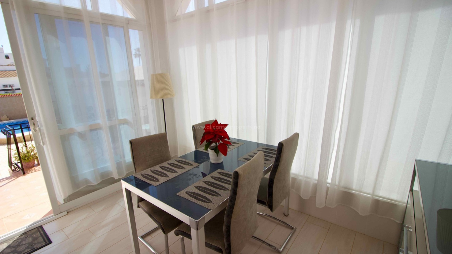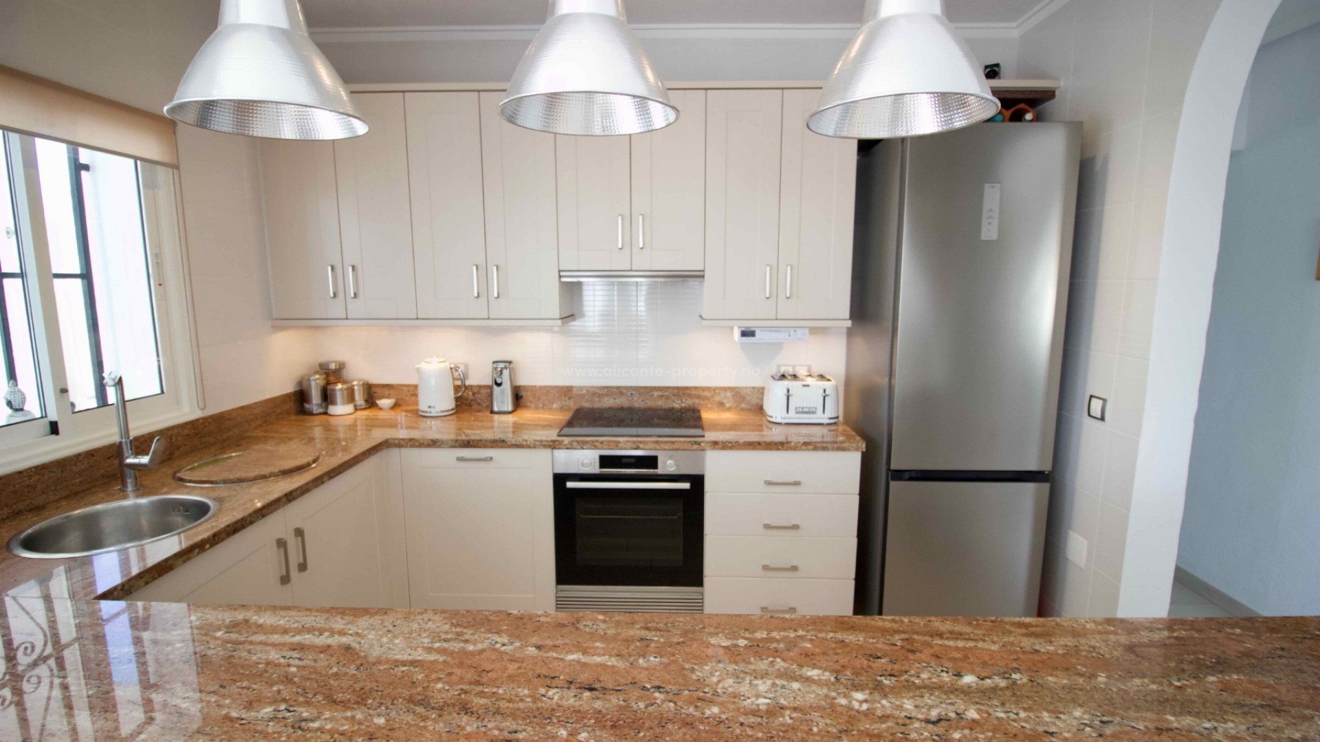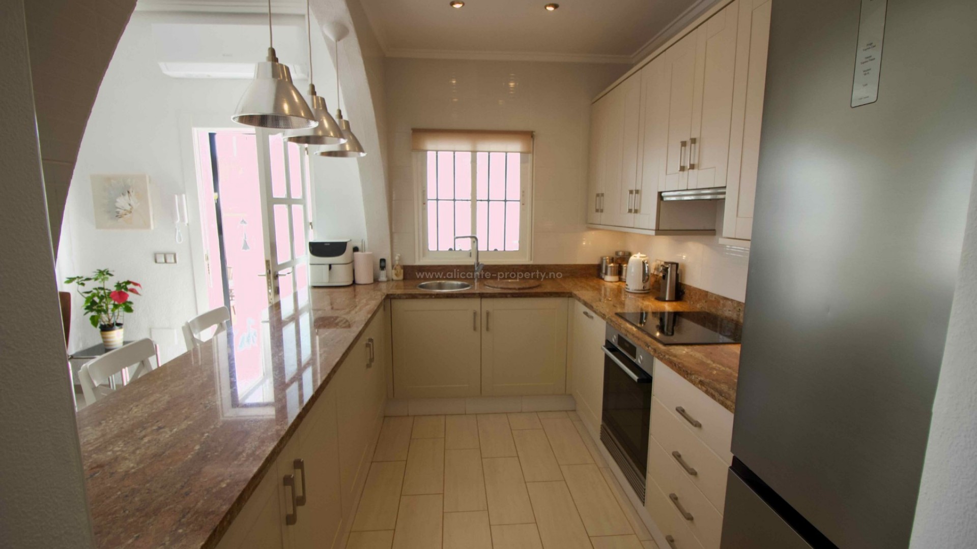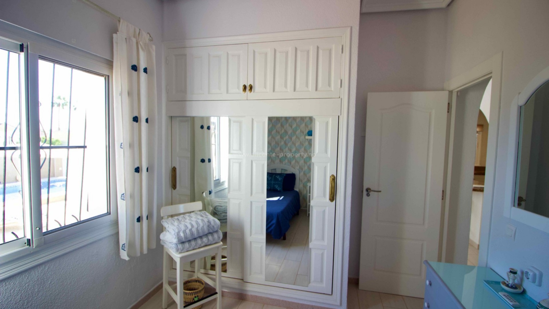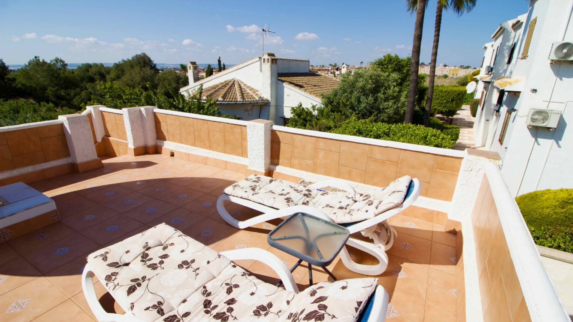Denne sjarmerende, perfekt vedlikeholdte, frittliggende villaen med tre soverom og to bad ligger i det ettertraktede Pueblo Bravo-området i Ciudad Quesada på den sørlige Costa Blanca. Et velkjent supermarked, barer, restauranter og en privatskole ligger innen gangavstand. Fasilitetene til Doña Pepa, inkludert et apotek, barer, restauranter, et medisinsk senter, en språkskole og det vakre spahotellet La Laguna, ligger også i nærheten. Bare en 5-minutters kjøretur unna ligger den populære hovedgaten i Quesada med en rekke restauranter, barer, supermarkeder, banker, en bensinstasjon, en bowlinghall og to handlegater. Den vakre La Marquesa golfbanen, med et velkjent supermarked og diverse barer og restauranter, er også lett tilgjengelig. Den herlige Recorral naturpark, med sine innsjøer og piknikområder, og Rojales familiebadeland ligger også en kort kjøretur unna. De nærmeste fantastiske sandstrendene ligger bare en 10-minutters kjøretur unna i Guardamar del Segura. Denne attraktive villaen i middelhavsstil har blitt utmerket vedlikeholdt og forbedret av de nåværende eierne, og tilbyr ideelt sett alle rom i én etasje. Innvendig finner du: en vakker glassterrasse som gir direkte tilgang til bassenget og hagen, som for tiden brukes som spiseplass; en romslig og innbydende stue med peis og trippelglass; et velproporsjonert, halvåpent kjøkken med frokostbar; to gjesterom, begge dobbeltrom med innebygde garderober; et moderne familiebad med badekar; og et imponerende hovedsoverom som er større enn gjennomsnittet med innebygde garderober og god lagringsplass, som også har et eget dusjrom og en ytterdør. Eiendommen ligger på en stor, privat, inngjerdet tomt i utmerket stand og krever minimalt vedlikehold. Den har et vakkert, soloppvarmet svømmebasseng med god plass til solsenger, en overbygd parkeringsplass med elektrisk port, fine overbygde stue-/spiseområder og diverse lagringsplasser på sidene og baksiden av huset. Det er også et privat, solfylt solarium på taket hvor du kan nyte den spanske solen og en vakker utsikt over omgivelsene. Boligen er også utstyrt med klimaanlegg og takvifter i alle rom, noe som gjør det komfortabelt hele året. Andre fordeler og bemerkelsesverdige funksjoner inkluderer: 14 solcellepaneler for høyere energieffektivitet, insektnett og UV-filtre på alle vinduer, en fjernstyrt ringeklokke, et alarmsystem og fjernstyrt bassengbelysning. Prisen for de vakre møblene er omsettelig og avhenger av budet som mottas.