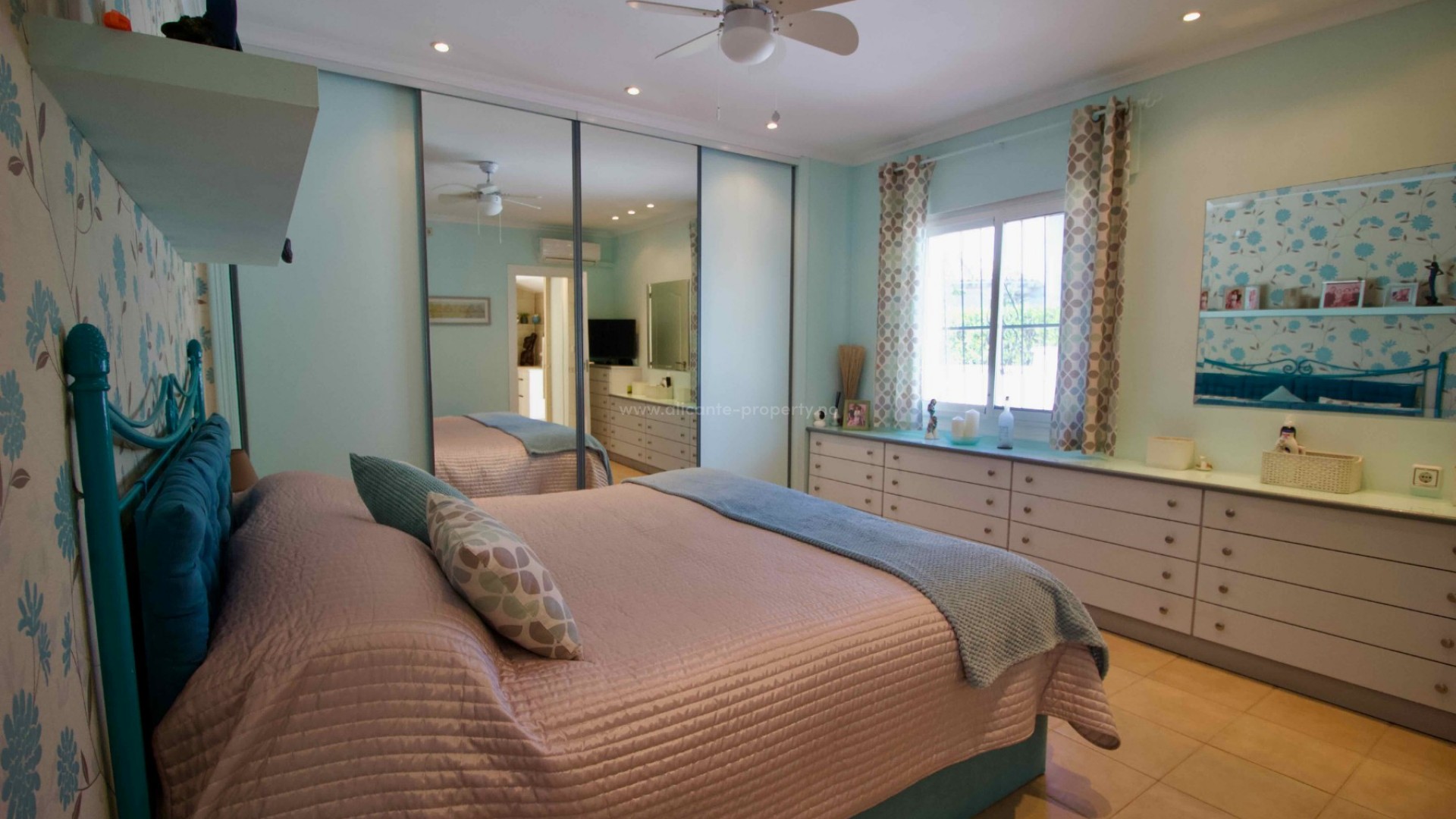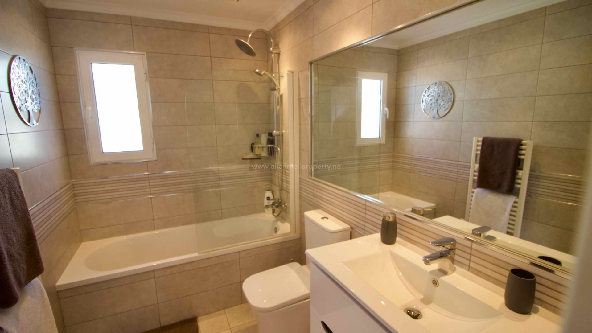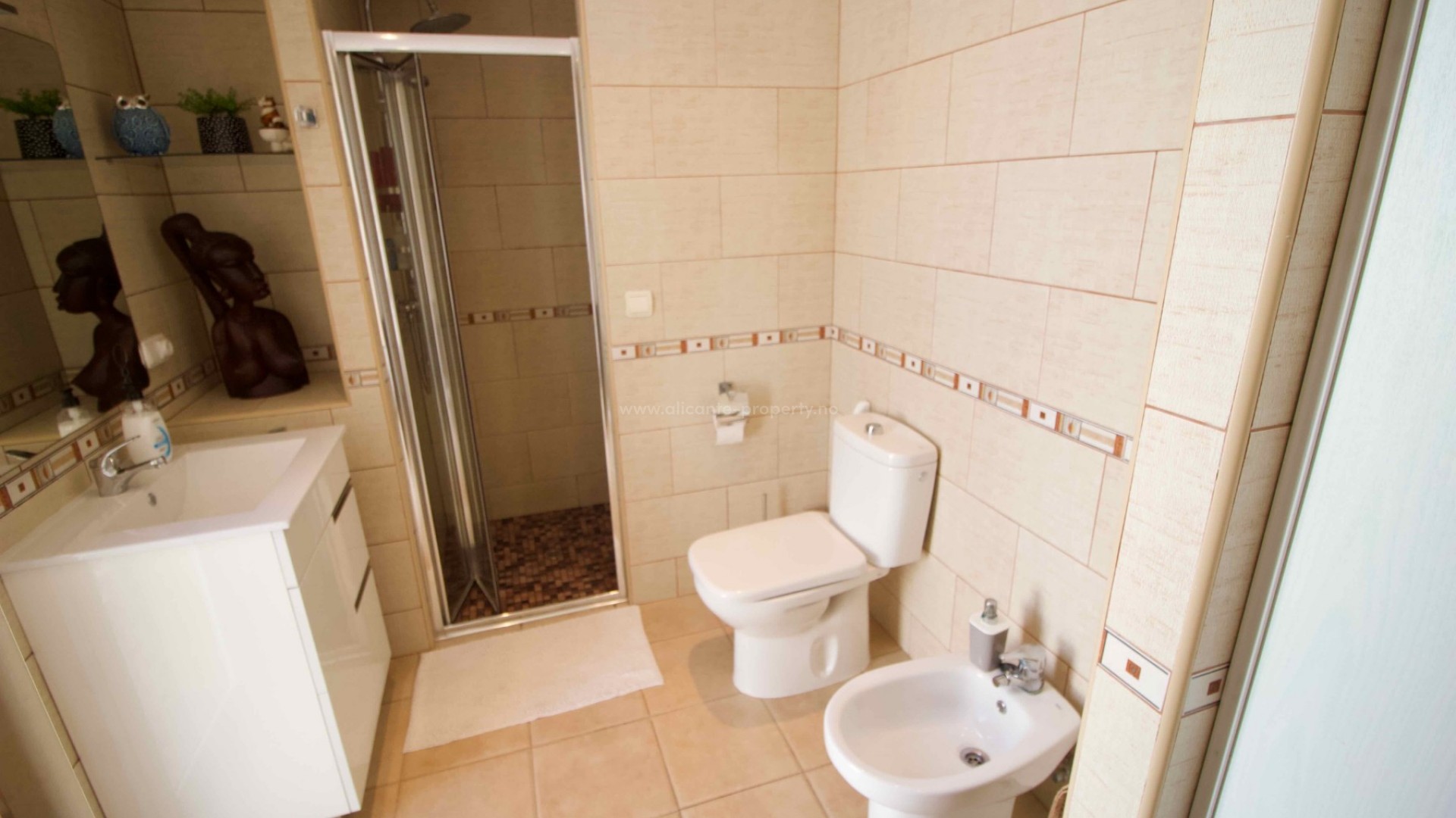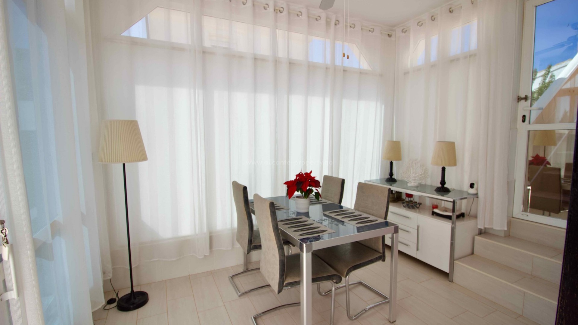 Denne sjarmerende, perfekt vedlikeholdte, frittliggende villaen med tre soverom og to bad ligger i det ettertraktede Pueblo Bravo-området i Ciudad Quesada på den sørlige Costa Blanca. Et velkjent supermarked, barer, restauranter og en privatskole ligger innen gangavstand. Fasilitetene til Doña Pepa, inkludert et apotek, barer, restauranter, et medisinsk senter, en språkskole og det vakre spahotellet La Laguna, ligger også i nærheten. Bare en 5-minutters kjøretur unna ligger den populære hovedgaten i Quesada med en rekke restauranter, barer, supermarkeder, banker, en bensinstasjon, en bowlinghall og to handlegater. Den vakre La Marquesa golfbanen, med et velkjent supermarked og diverse barer og restauranter, er også lett tilgjengelig. Den herlige Recorral naturpark, med sine innsjøer og piknikområder, og Rojales familiebadeland ligger også en kort kjøretur unna. De nærmeste fantastiske sandstrendene ligger bare en 10-minutters kjøretur unna i Guardamar del Segura. Denne attraktive villaen i middelhavsstil har blitt utmerket vedlikeholdt og forbedret av de nåværende eierne, og tilbyr ideelt sett alle rom i én etasje. Innvendig finner du: en vakker glassterrasse som gir direkte tilgang til bassenget og hagen, som for tiden brukes som spiseplass; en romslig og innbydende stue med peis og trippelglass; et velproporsjonert, halvåpent kjøkken med frokostbar; to gjesterom, begge dobbeltrom med innebygde garderober; et moderne familiebad med badekar; og et imponerende hovedsoverom som er større enn gjennomsnittet med innebygde garderober og god lagringsplass, som også har et eget dusjrom og en ytterdør. Eiendommen ligger på en stor, privat, inngjerdet tomt i utmerket stand og krever minimalt vedlikehold. Den har et vakkert, soloppvarmet svømmebasseng med god plass til solsenger, en overbygd parkeringsplass med elektrisk port, fine overbygde stue-/spiseområder og diverse lagringsplasser på sidene og baksiden av huset. Det er også et privat, solfylt solarium på taket hvor du kan nyte den spanske solen og en vakker utsikt over omgivelsene. Boligen er også utstyrt med klimaanlegg og takvifter i alle rom, noe som gjør det komfortabelt hele året. Andre fordeler og bemerkelsesverdige funksjoner inkluderer: 14 solcellepaneler for høyere energieffektivitet, insektnett og UV-filtre på alle vinduer, en fjernstyrt ringeklokke, et alarmsystem og fjernstyrt bassengbelysning. Prisen for de vakre møblene er omsettelig og avhenger av budet som mottas.