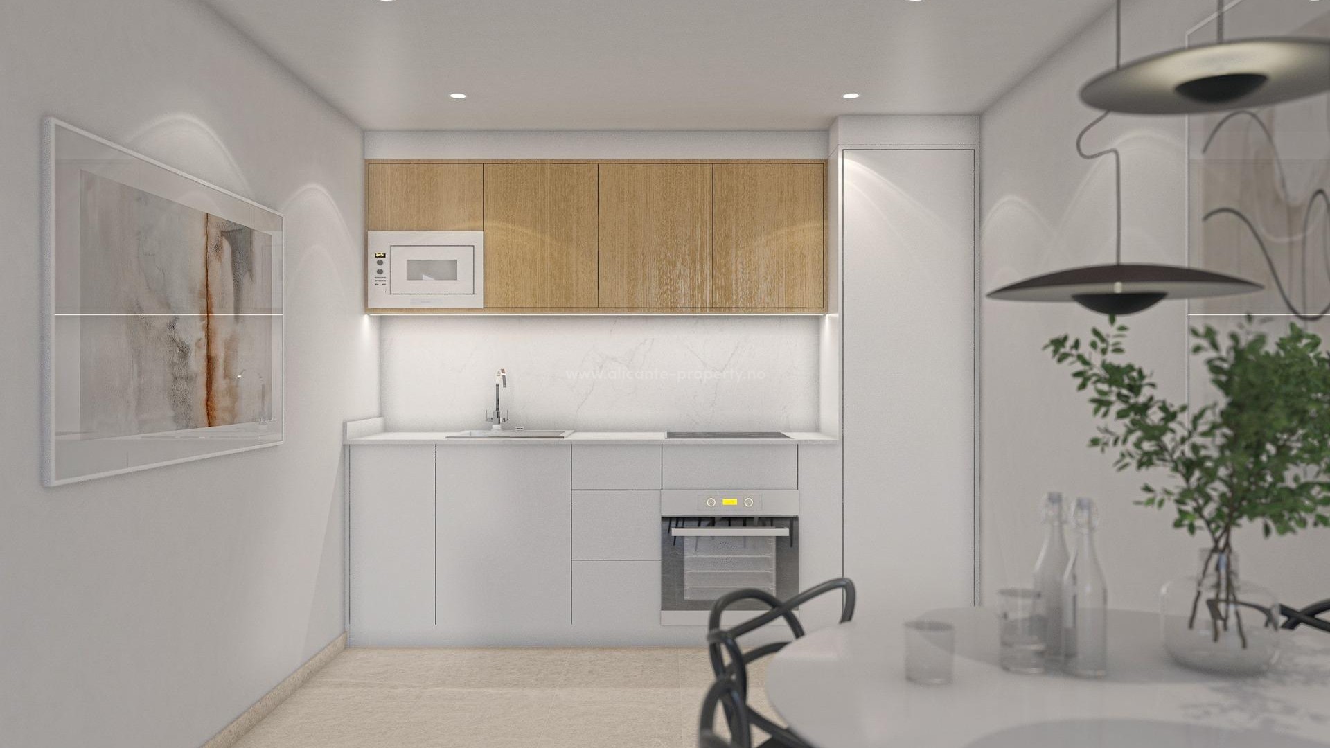 Moderne leiligheter med felles svømmebasseng nær stranden i San Pedro del Pinatar Eksklusive nybyggleiligheter på Costa Calida Oppdag dette eksklusive boligprosjektet med 12 moderne leiligheter, designet for å tilby komfort, funksjonalitet og livskvalitet i et av de mest attraktive områdene på Costa Calida. Dette boligkomplekset ligger i nærheten av Lo Pagan i San Pedro del Pinatar og kombinerer et rolig boligmiljø med enkel tilgang til kysten og alle nødvendige tjenester. Området er kjent for sin avslappede middelhavsstil, naturlige strender og berømte leirebad. Med butikker, restauranter, supermarkeder og fritidsfasiliteter i nærheten er dette stedet ideelt både for fast bolig og ferieopphold. Førsteklasses beliggenhet nær strender og strandpromenade Prosjektet ligger bare 3 km fra strendene i La Torre og den populære Lo Pagan-promenaden, hvor du kan nyte strandpromenader, strandbarer og vannsportaktiviteter. Mar Menor byr på rolige og varme farvann, perfekt for familier og friluftsentusiaster. Moderne design med fleksible planløsninger Prosjektet tilbyr leiligheter med 1 og 2 soverom i ulike konfigurasjoner for å passe ulike livsstiler. Leilighetene i første etasje har store private terrasser, parkering på tomten og direkte tilgang til fellesbassenget. Leilighetene i toppetasjen har private solterrasser på taket, ideelt for å nyte solen og friluftslivet. Alle boligene er designet med åpne oppholdsrom som kombinerer kjøkken, spisestue og stue med direkte tilgang til terrasser. Soverommene har innebygde garderober, og hovedsoverommet har eget bad. Høykvalitets finish og energieffektivitet Disse leilighetene er bygget med fokus på komfort og bærekraft. Funksjonene inkluderer forhåndsinstallasjon for kanalisert klimaanlegg, forhåndsinstallasjon for sentralvarme med naturgass og et aerotermisk system for varmt vann. Badene er fullt utstyrt med møbler, speil og dusjvegger, mens det er installert elektriske persienner i stuen. Ekstra tekniske belysnings- og ventilasjonssystemer sikrer et behagelig inneklima hele året. Fellesarealer designet for avslapning Boligkomplekset tilbyr et vakkert designet fellesområde med et svømmebasseng med strandlignende inngang, perfekt for å slappe av og kjøle seg ned. En egen avslapningssone med solsenger og skyggefulle områder skaper et innbydende rom for sosialt samvær og avslapning. Ytterligere fasiliteter inkluderer utendørs parkering med forhåndsinstallasjon for lading av elbiler og et felles sykkeloppbevaringsområde, noe som fremmer en bærekraftig og aktiv livsstil. Utmerket tilknytning og nærliggende fasiliteter Dette prosjektet har en ideell beliggenhet med enkel tilgang til viktige severdigheter. Murcia internasjonale lufthavn ligger omtrent 35 km unna, og Alicante lufthavn rundt 75 km. Flere golfbaner ligger innenfor 10 til 15 km, og nærliggende marinaer tilbyr utmerkede nautiske fasiliteter. Ideell mulighet for investering eller feriebolig Disse leilighetene tilbyr en utmerket mulighet til å nyte et moderne liv ved kysten i et område med gode forbindelser og høy etterspørsel. Kontakt oss i dag for mer informasjon eller for å avtale en visning og sikre deg din nye leilighet nær sjøen i San Pedro del Pinatar.