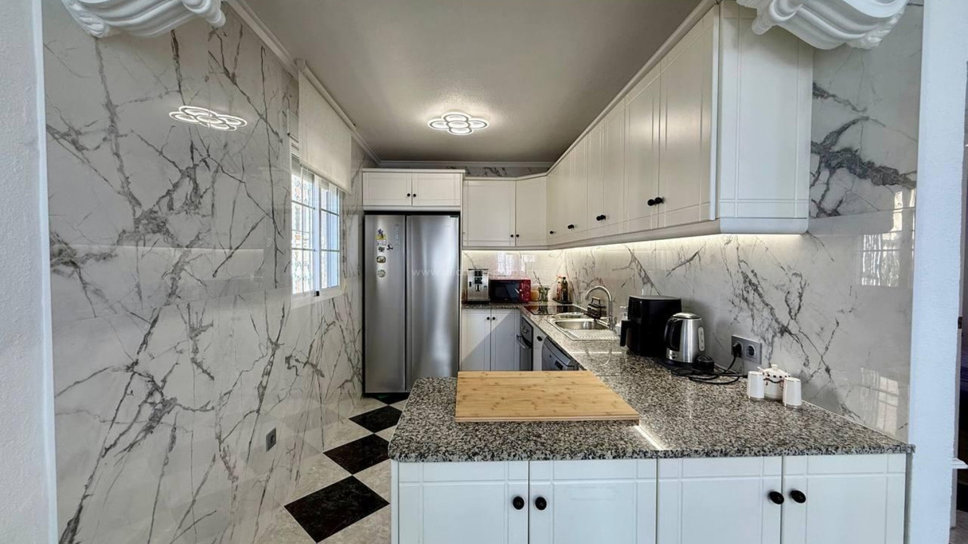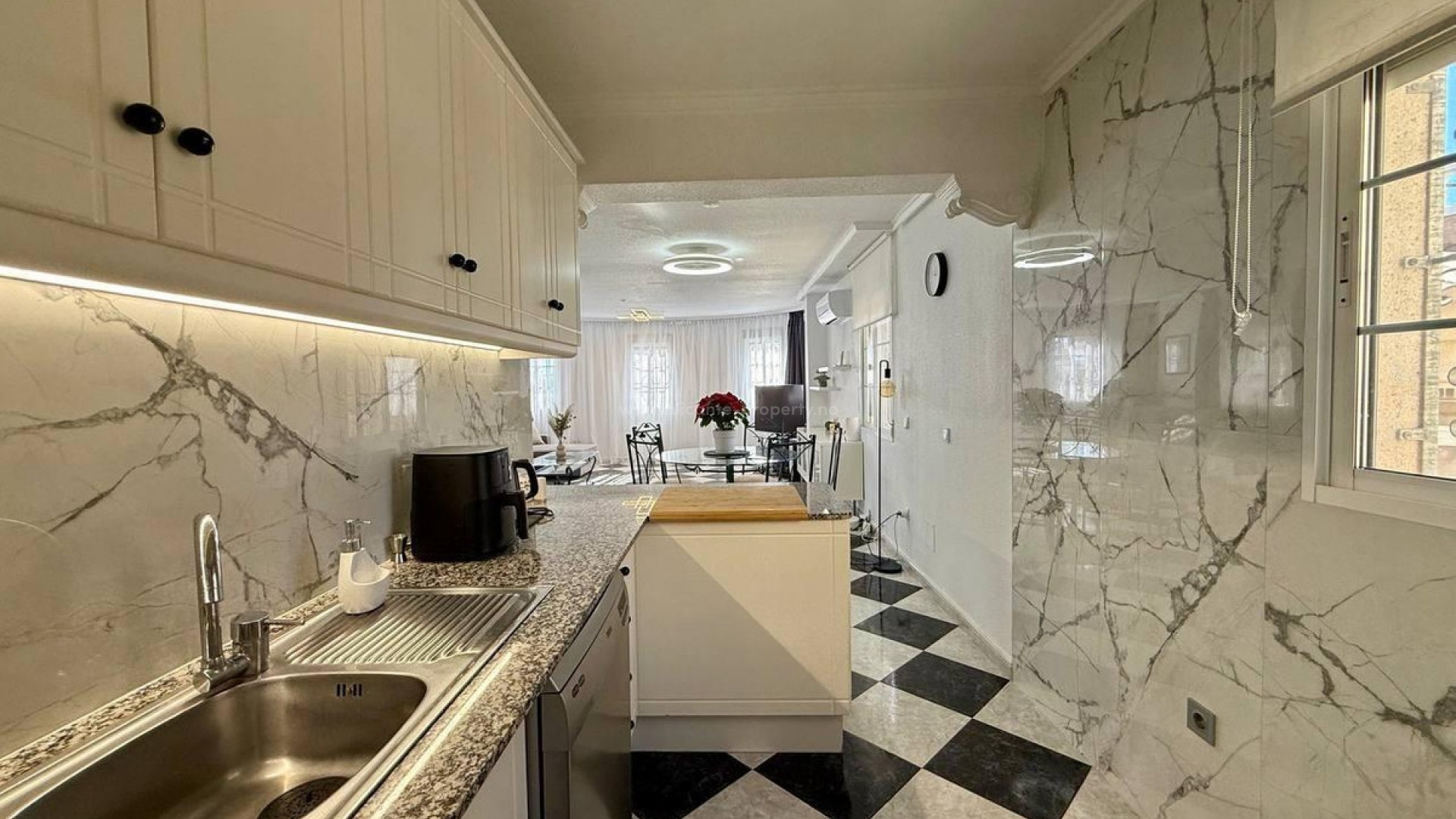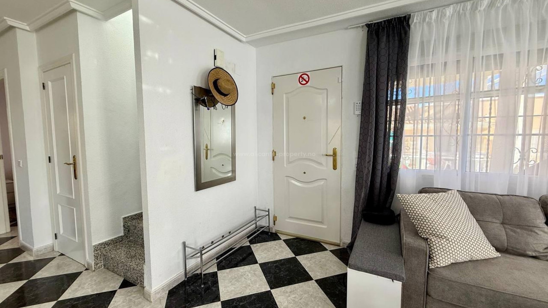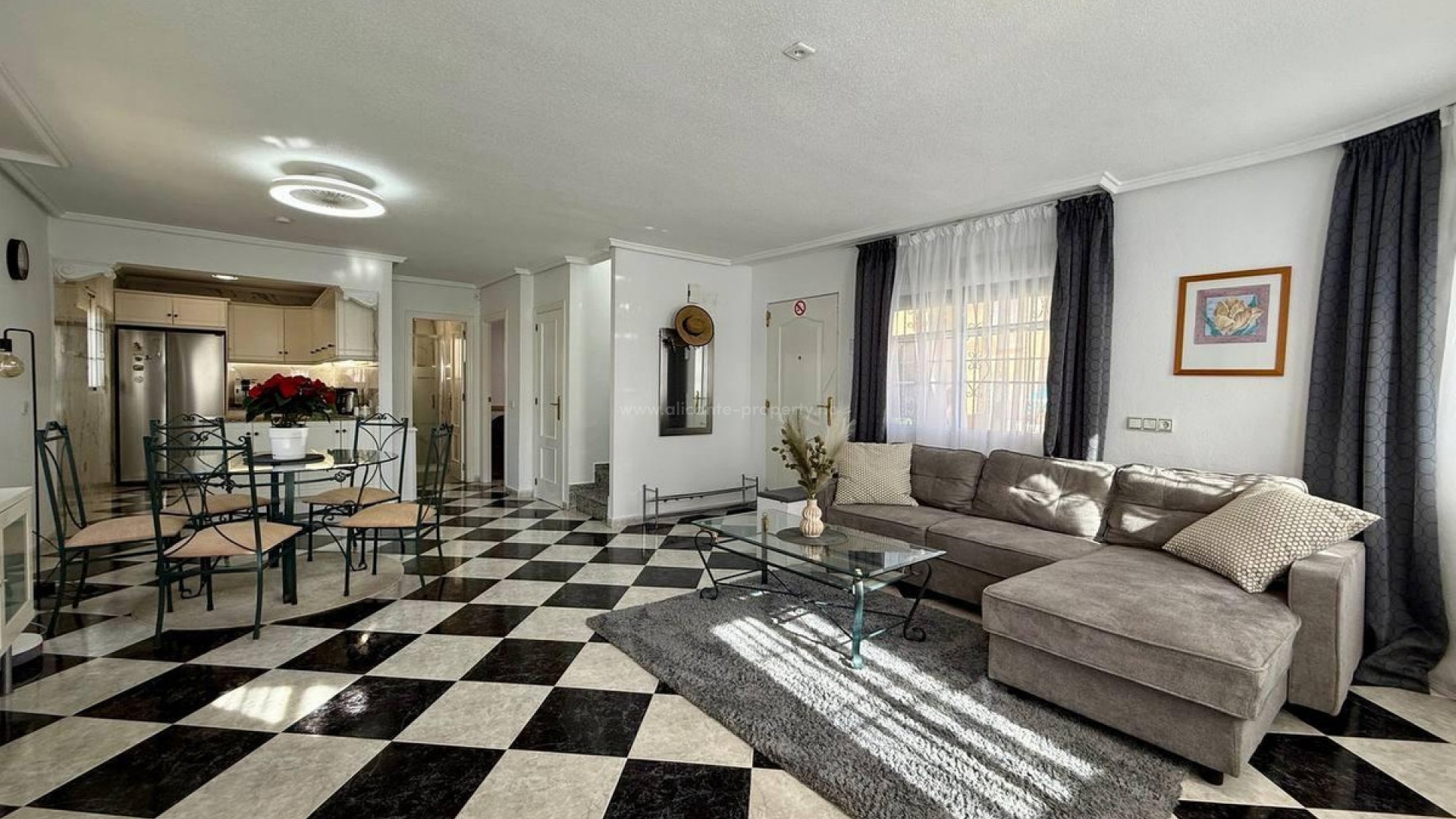Denne villaen ligger i et ettertraktet område i PLAYA FLAMENCA, og tilbyr 191 m² boareal, omhyggelig designet for maksimal komfort og funksjonalitet. Huset er fordelt over tre etasjer. Første etasje har en romslig og lys stue, et fullt utstyrt kjøkken, et soverom og et bad. Andre etasje inneholder to soverom og et bad, hvorav det ene har tilgang til en stor terrasse. Kjelleren har et soverom og et bad, et vaskerom og en bod. Arkitekturen kombinerer romslige og lyse områder med eksklusive detaljer som gjør dette hjemmet til et unikt trekk. Husets eksteriør er omgitt av vakre trær, noe som skaper en atmosfære av ro og absolutt privatliv. Det er også en garasje og et felles svømmebasseng.