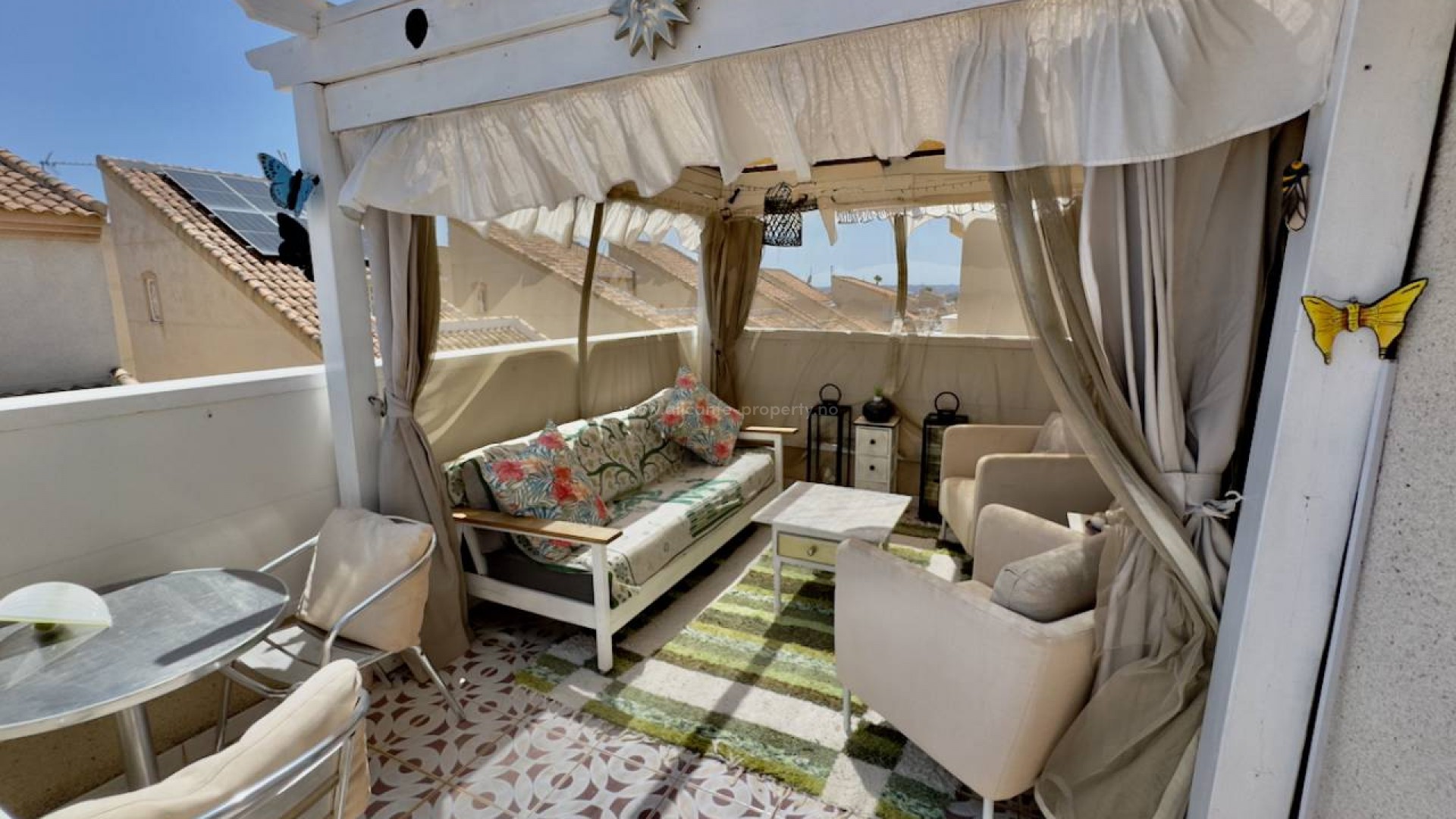 Eiendomsbeskrivelse Dette vakkert vedlikeholdte hjemmet med 3 soverom og 2 bad ligger på en tomt på 200 m² med et bebygd areal på 90 m², og tilbyr den perfekte blandingen av innendørs komfort og utendørs nytelse. Eiendommen er i utmerket stand og har en rekke attraktive fasiliteter, inkludert mye lagringsplass, og bare 300 meters gange til det vakre felles svømmebassenget. Soverom: 3 Bad: 2 (inkludert et ensuite) Kjøkken: Separat, fullt utstyrt med hvitevarer Innebygde garderober: 3 Orientering: Østvendt Møblering: Delvis møblert Nyt fellesbassenget, private hager og et solarium med hageutsikt – perfekt for avslapning eller underholdning. Innvendig er hjemmet utstyrt med klimaanlegg, takvifter og vedovn for komfort året rundt. Et alarmsystem gir ekstra trygghet. Beliggenhetshøydepunkter: 10 minutter til stranden 30 minutter til flyplassen 5 minutter til fasiliteter og golfbaner ✅ Ytterligere funksjoner: Østvendt for morgensol Hovedsoverom med eget bad Innebygde garderober Hageutsikt Hvitevarer inkludert