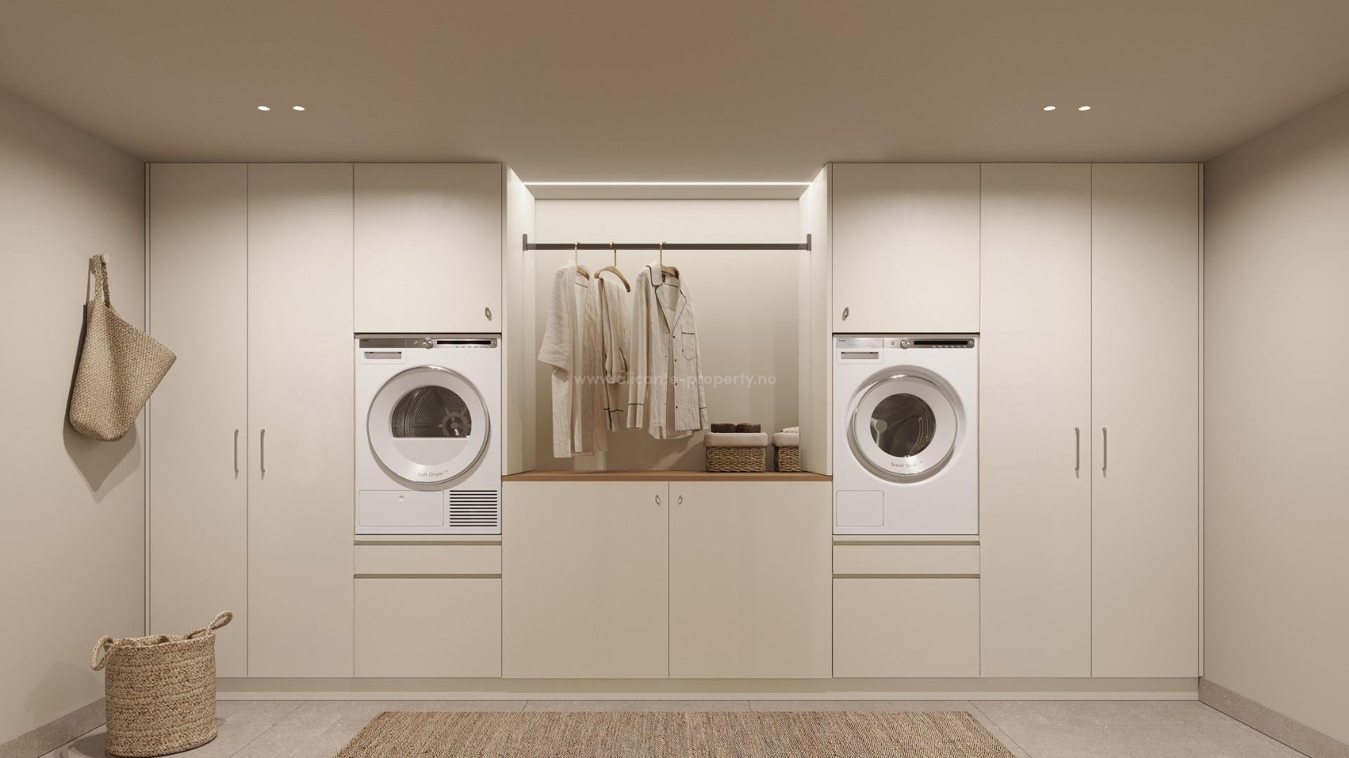 Nybyggede villaer i La Finca Golf, Algorfa: Moderne luksus i hjertet av Costa Blanca Eksklusivt prosjekt med 6 frittliggende villaer Denne eksklusive samlingen av seks nybyggede villaer i La Finca Golf, Algorfa, tilbyr en enestående mulighet til å nyte luksus, komfort og middelhavsliv i et av de mest prestisjefylte golfresortene på Costa Blanca Sør. Disse moderne boligene er designet med eleganse og funksjonalitet i tankene, og har romslig interiør, private hager og førsteklasses finish. Elegant design og romslig planløsning Hver villa er fordelt på første etasje og kjeller, og tilbyr mer enn 300 m² boareal. Planløsningen inkluderer 4 soverom, alle med eget bad, et ekstra gjestetoalett og et lyst åpent kjøkken og stue med direkte tilgang til terrassen og bassengområdet. Kjelleren har garasje, vaskerom og bod, noe som sikrer praktisk og bekvemmelig bruk. Store vinduer fyller interiøret med naturlig lys og skaper en sømløs forbindelse mellom innendørs og utendørs områder, perfekt for å nyte det milde middelhavsklimaet hele året. Førsteklasses funksjoner og energieffektivitet Hver villa er bygget etter de høyeste standarder, med materialer av topp kvalitet og avanserte energieffektive systemer: Fullt utstyrt kjøkken med hvitevarer. Bad med gulvvarme, innredning med speil og dusjvegger. Aerotermisk varmtvannssystem. Kanalisert klimaanlegg med Airzone-kontroll. 4 kW solcellepaneler for energibesparelser. Motoriserte persienner i soverommene. LED-belysning i hele interiøret og eksteriøret. Privat svømmebasseng og anlagt hage. Disse funksjonene sikrer maksimal komfort, bærekraft og et lavt miljøavtrykk. Førsteklasses beliggenhet i La Finca Golf Resort Disse villaene ligger i La Finca Golf Resort i Algorfa, og nyter godt av et rolig og eksklusivt miljø omgitt av natur og golfbaner. Beboerne har nærhet til restauranter, et 5-stjerners hotell med spa-fasiliteter og en rekke fritidsaktiviteter. Avstander til viktige severdigheter: La Finca golfbane: 1200 m Guardamar del Segura-stranden: 13 km (15 minutter) Alicante internasjonale lufthavn: 35 minutter Almoradí, Benijófar, Ciudad Quesada: 5–10 km Torrevieja og Orihuela Costa: 15 minutter Lev det middelhavske golf-livet Disse nybygde villaene i La Finca Golf, Algorfa, kombinerer moderne arkitektur, høykvalitets finish og en uovertruffen beliggenhet, og er det perfekte hjemmet for golfentusiaster og de som søker ro nær kysten. Kontakt oss i dag for å avtale et besøk og oppdag ditt nye liv på Costa Blanca.