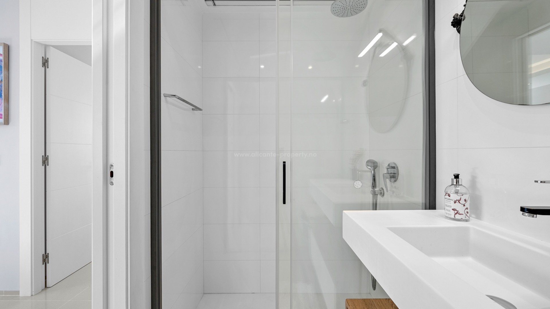 Vi har gleden av å presentere denne eksepsjonelle eiendommen – en moderne tomannsbolig i to etasjer, beliggende i et av de mest ettertraktede områdene på Costa Blanca. Dette elegante hjemmet kombinerer perfekt hverdagens komfort med sjarmen til spansk arkitektur og luksusen til et feriested. Første etasje har en romslig, lys stue med åpen kjøkkenløsning, et soverom, et vaskerom og direkte tilgang til terrassen og den private hagen – det perfekte stedet for morgenkaffen eller et kveldsmåltid omgitt av grøntområder. I øverste etasje finner du to komfortable soverom, hvert med eget bad og privat balkong. På toppen tilbyr et stort takterrasse et privat sted å slappe av og nyte solen hele året. Hele prosjektet skiller seg ut med sine høykvalitets finisher – moderne interiør, elegante materialer, fullt utstyr og nøye utvalgte møbler skaper en atmosfære av luksus og komfort. Beboerne kan nyte et vakkert felles svømmebasseng, omgitt av velholdte hager og avslappende fritidsområder, ideelt for å nyte middelhavslivsstilen. Ciudad Quesada tilbyr en utmerket beliggenhet – nær store supermarkeder, restauranter, butikker, kafeer og prestisjefylte golfbaner. Sandstrendene i Guardamar og La Mata ligger bare 8 km unna, mens Alicante lufthavn kan nås på rundt 35 minutter. Å bo i Spania betyr mer enn 300 soldager hvert år, et fredelig tempo i livet, utmerket mat og et imøtekommende internasjonalt samfunn. Dette hjemmet er den perfekte kombinasjonen av stil, kvalitet og komfort – ideelt både som permanent bolig og en lønnsom investering for ferieboliger.