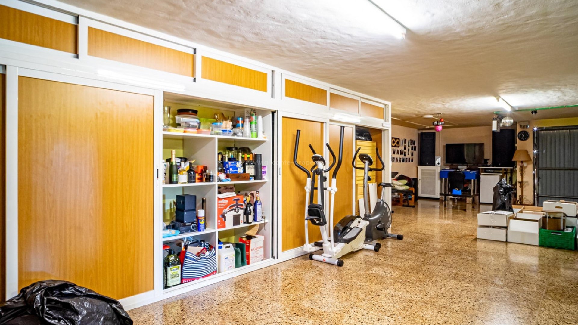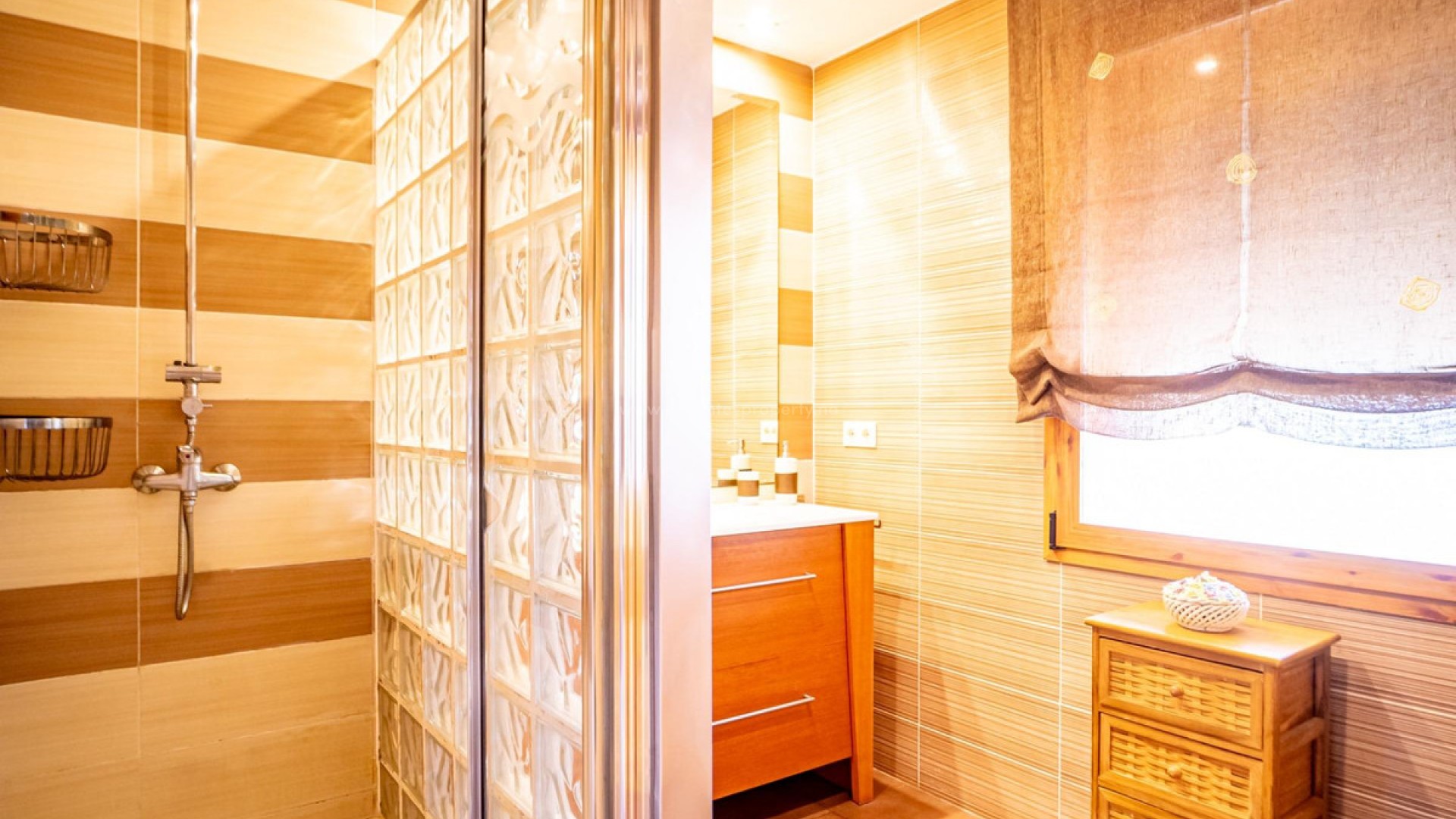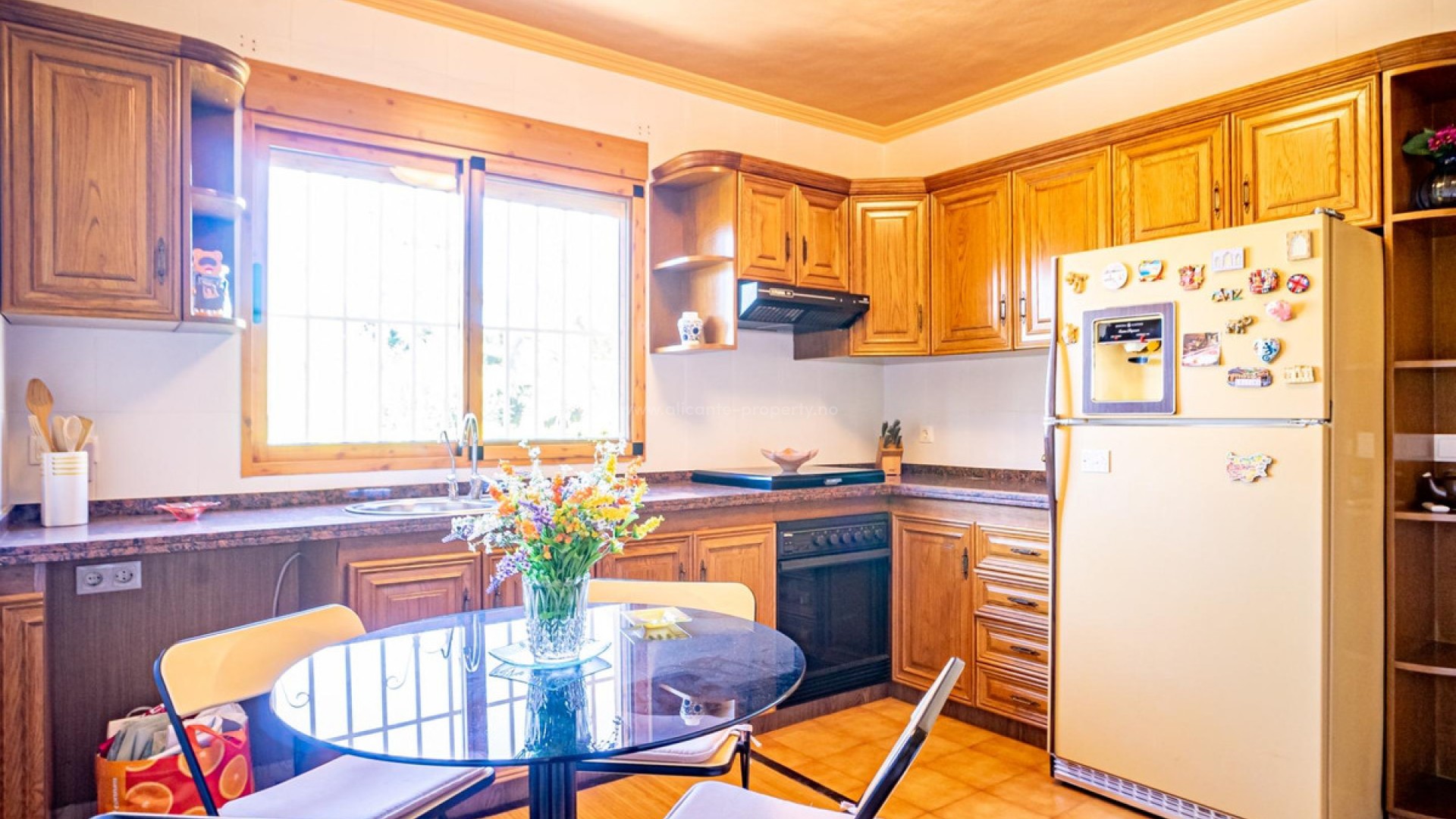This villa is a large and ideal home for a family. On the ground floor there are two bedrooms, a spacious living room with a fireplace, a bathroom with shower, and a kitchen. This floor has its own independent entrance and can be used as a separate apartment. There is also a large garage on this level. The upper floor, connected to the lower one by an internal staircase, also has its own entrance. It features an entrance hall, a kitchen, a large living room with fireplace, three bedrooms (one currently used as a walk-in dressing room), and two bathrooms. The master bedroom is spacious and includes an en-suite bathroom. From both the master bedroom and the living room, there is access to a large covered balcony offering panoramic views of the sea, Benidorm, and the mountains. From the balcony, you can access a solarium with even more impressive views. Surrounding the house is a flat garden with an outdoor kitchen, parking space for several cars, and a swimming pool. The property is equipped with several air conditioning units providing both heating and cooling. It is located in a quiet residential community with communal areas that include a swimming pool, garden, two tennis courts, and a room for parties and celebrations. Benidorm and all amenities are just a couple of minutes away by car.