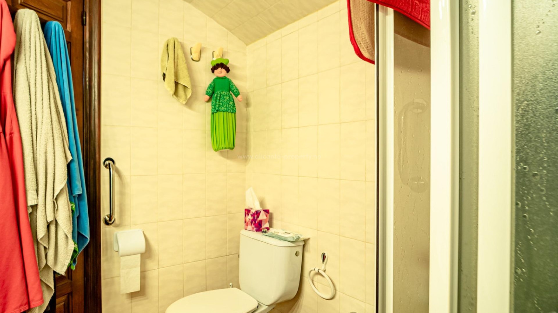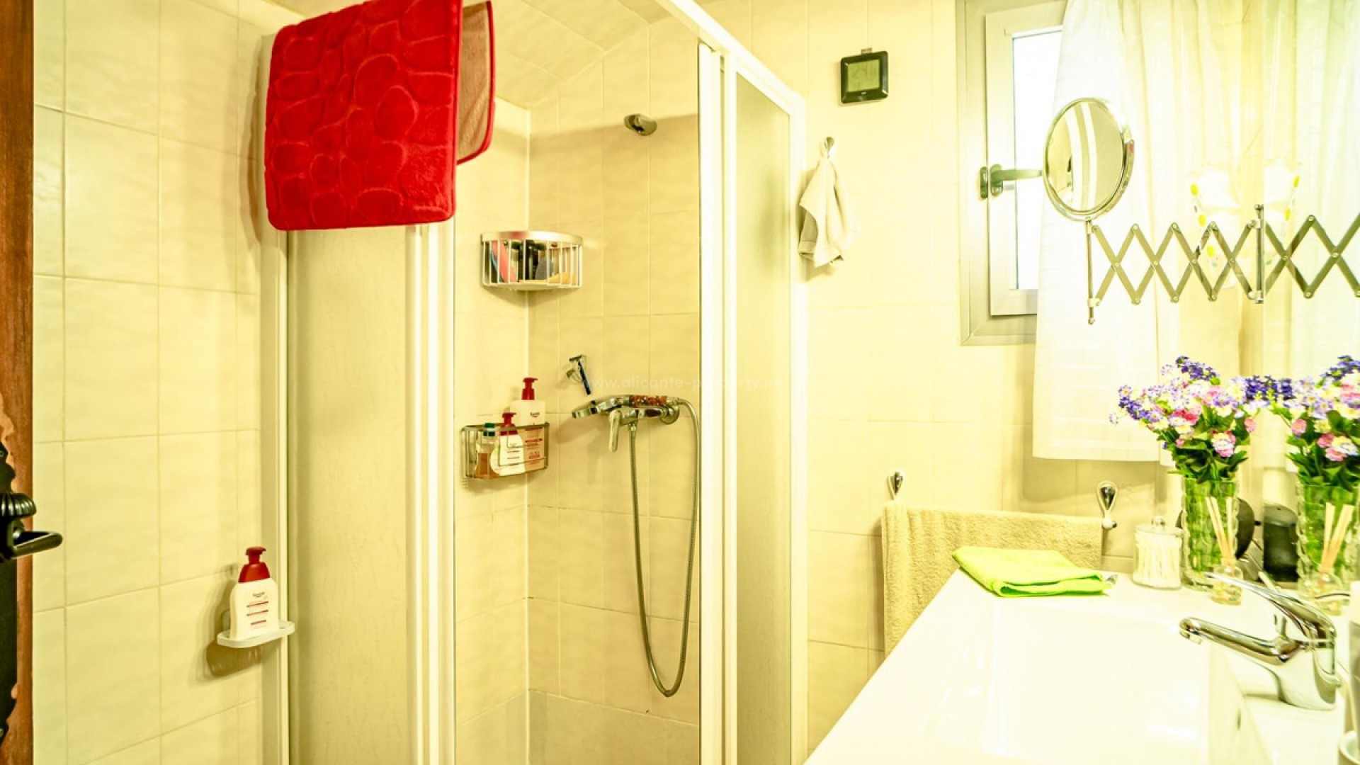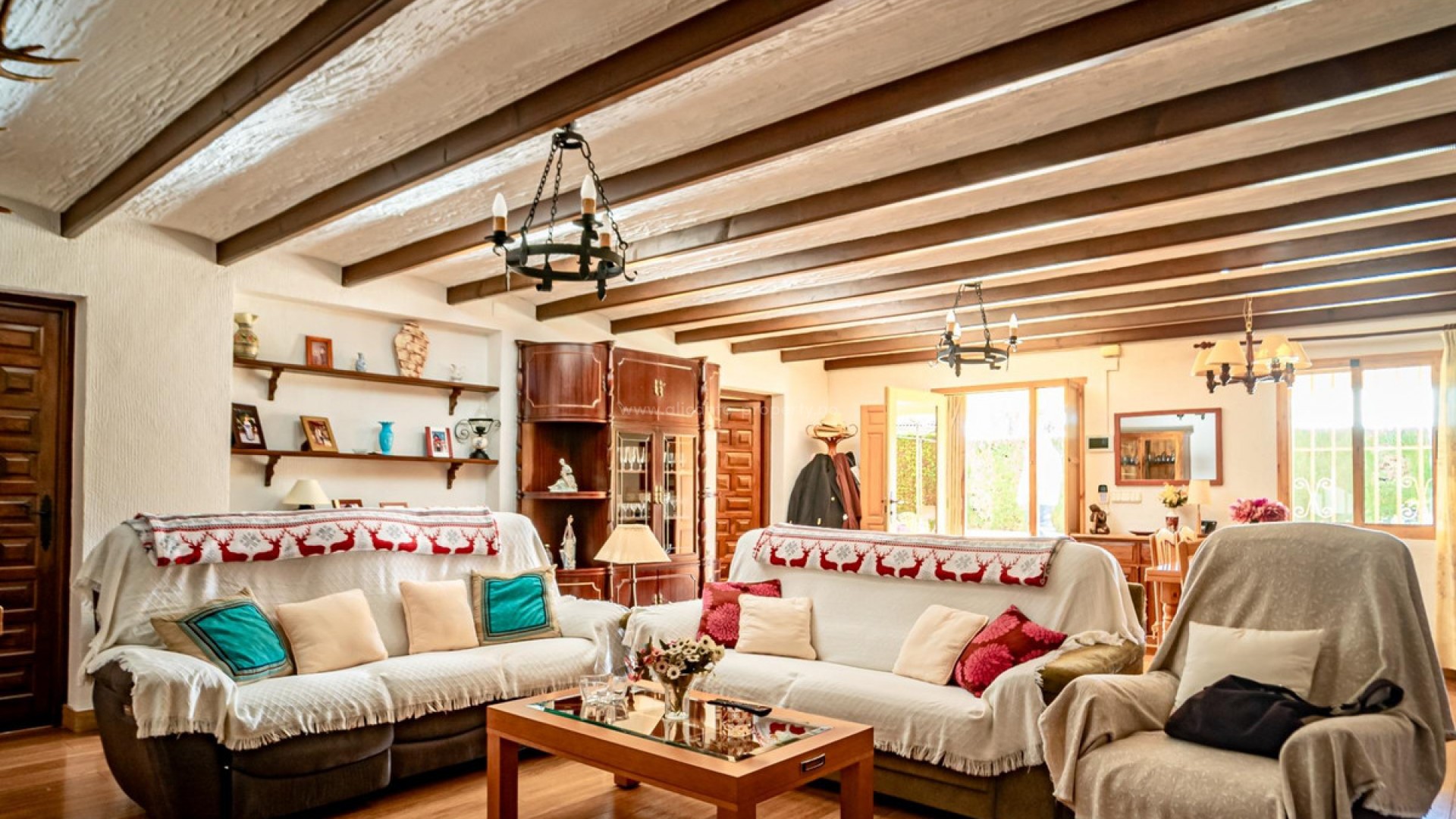 This villa is a large and ideal home for a family. On the ground floor there are two bedrooms, a spacious living room with a fireplace, a bathroom with shower, and a kitchen. This floor has its own independent entrance and can be used as a separate apartment. There is also a large garage on this level. The upper floor, connected to the lower one by an internal staircase, also has its own entrance. It features an entrance hall, a kitchen, a large living room with fireplace, three bedrooms (one currently used as a walk-in dressing room), and two bathrooms. The master bedroom is spacious and includes an en-suite bathroom. From both the master bedroom and the living room, there is access to a large covered balcony offering panoramic views of the sea, Benidorm, and the mountains. From the balcony, you can access a solarium with even more impressive views. Surrounding the house is a flat garden with an outdoor kitchen, parking space for several cars, and a swimming pool. The property is equipped with several air conditioning units providing both heating and cooling. It is located in a quiet residential community with communal areas that include a swimming pool, garden, two tennis courts, and a room for parties and celebrations. Benidorm and all amenities are just a couple of minutes away by car.