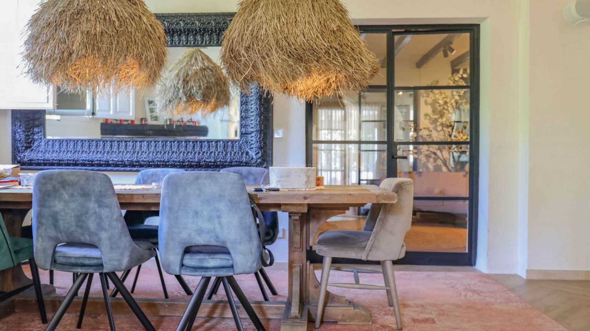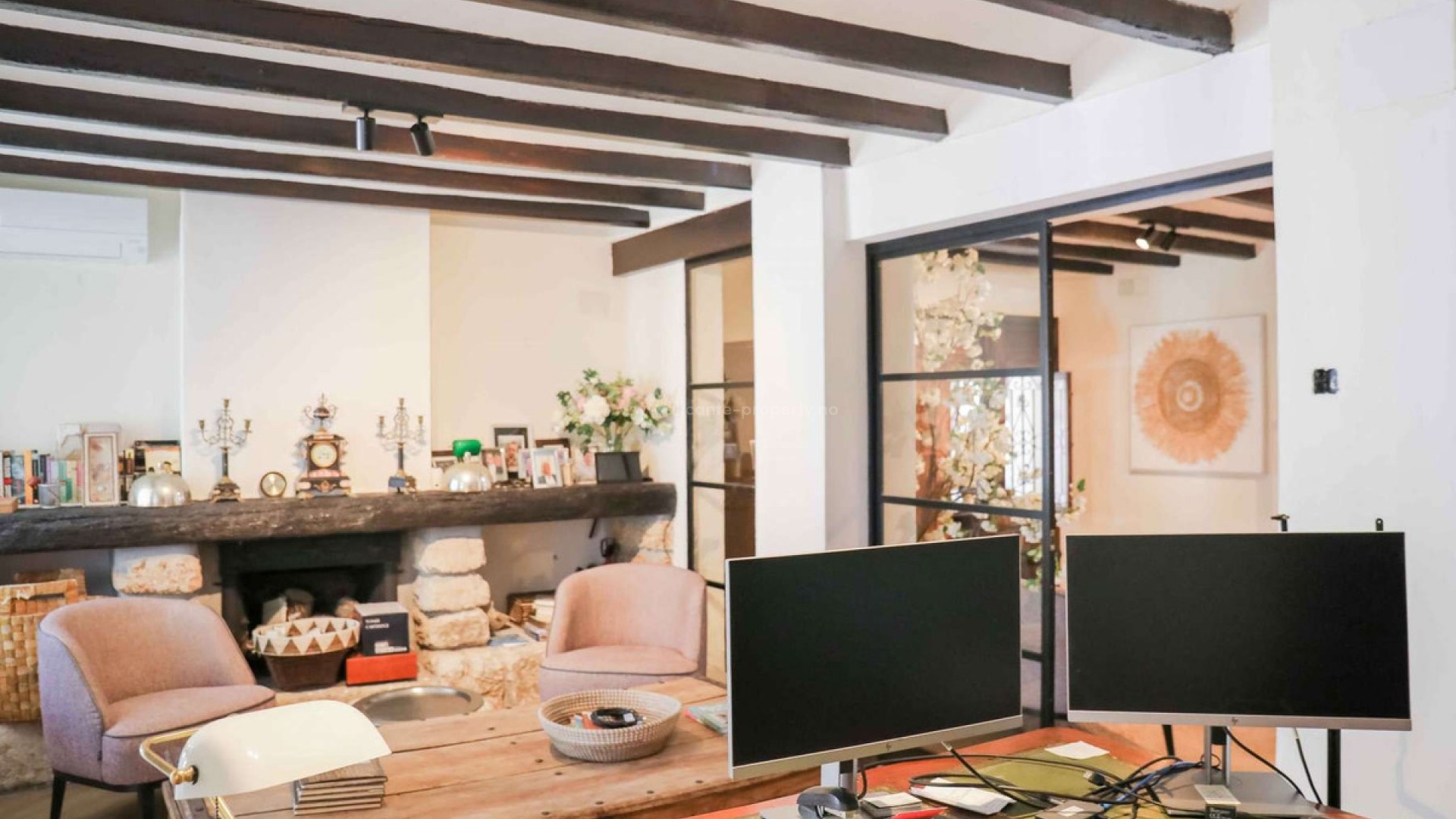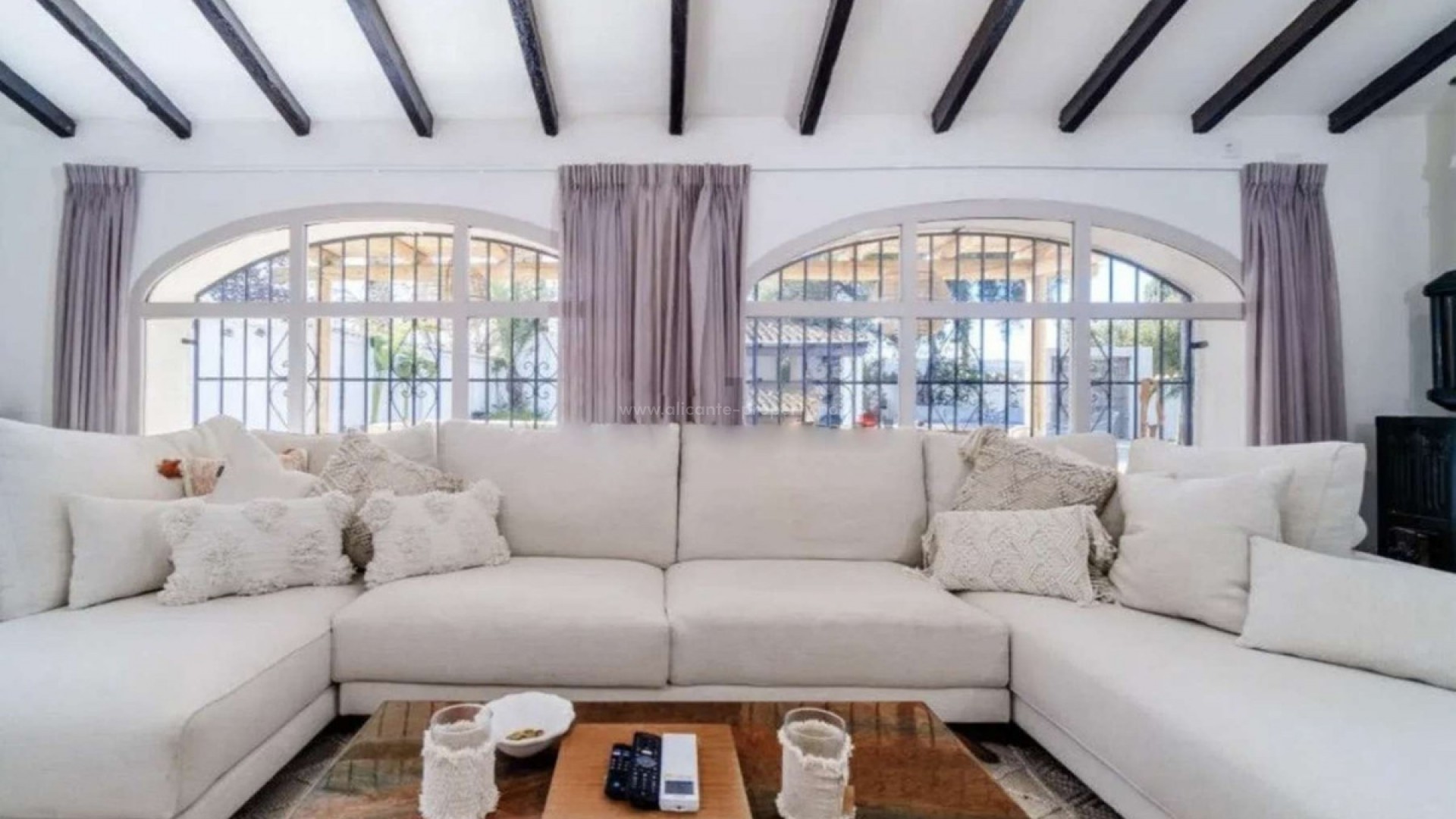 Thoughtfully restored with impeccable attention to detail, this remarkable home offers a serene and secluded haven, all while keeping essential amenities within easy reach, situated on a plot of 11.637 sqm with a constructed area of 548 sqm- Situated on a level plot, the residence unfolds across two expansive floors. The main level boasts a sleek, modern kitchen featuring a bold central island, ideal for shared meals and gatherings. Adjacent, a refined dining area with a cozy fireplace sets a welcoming tone, while a corridor opens to a flexible room currently serving as a study but easily adaptable as an extra bedroom. The airy living space, flooded with light through oversized windows, beckons for moments of relaxation. Ascend the elegant staircase to the upper level, where the opulent primary suite awaits, complete with a walk-in closet and private bathroom. Step onto the suite's exclusive terrace to savor stunning, uninterrupted views of the iconic Montgó mountain. The property also includes two self-contained guest suites, each with two bedrooms and a bathroom, offering comfort and independence for visitors. A well-appointed laundry area enhances the home's practicality. Outside, the grounds are a true retreat. Vast terraces, a generous pool, and inviting lounge spaces create an idyllic backdrop for outdoor enjoyment. A fully equipped outdoor kitchen is perfect for hosting memorable gatherings, and a forthcoming sauna will soon elevate the estate's wellness appeal. Additional highlights include zoned air conditioning, plentiful parking, and a spacious garage accommodating three cars.Located 10 km from Javea and its beach, 105 km from Alicante Airport and 113 km from the Alicante Airport.