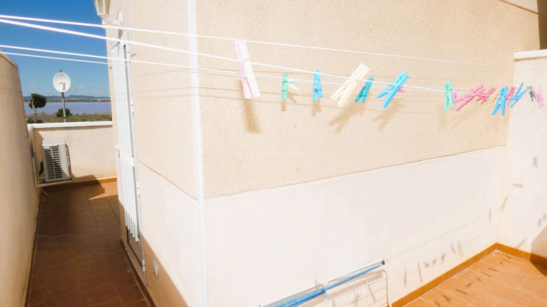Welcome to this charming 83 m² townhouse, which offers a perfect home with stunning views. Here you will be greeted by two terraces on different levels. On the ground floor there is a large living room, kitchen and dining place and a patio with washing machine and storage. Upstairs there are two spacious bedrooms with built-in wardrobes and a large bathroom. This house has a west-facing balcony and roof terrace that offers stunning views of the mountains and the salt lake, making it the perfect place to relax. Enjoy access to a large and well-maintained communal pool, where you can cool off on those hot sunny days. The house is fully furnished and ready for you to move into immediately. Torrevieja is a lovely coastal resort known for its beautiful beaches and pleasant climate. The area offers a wide range of amenities, including shops, restaurants and entertainment options, making it easy to enjoy a comfortable lifestyle. In addition, there is a golf course nearby, perfect for golf enthusiasts. Don't miss the chance to own this fantastic home!