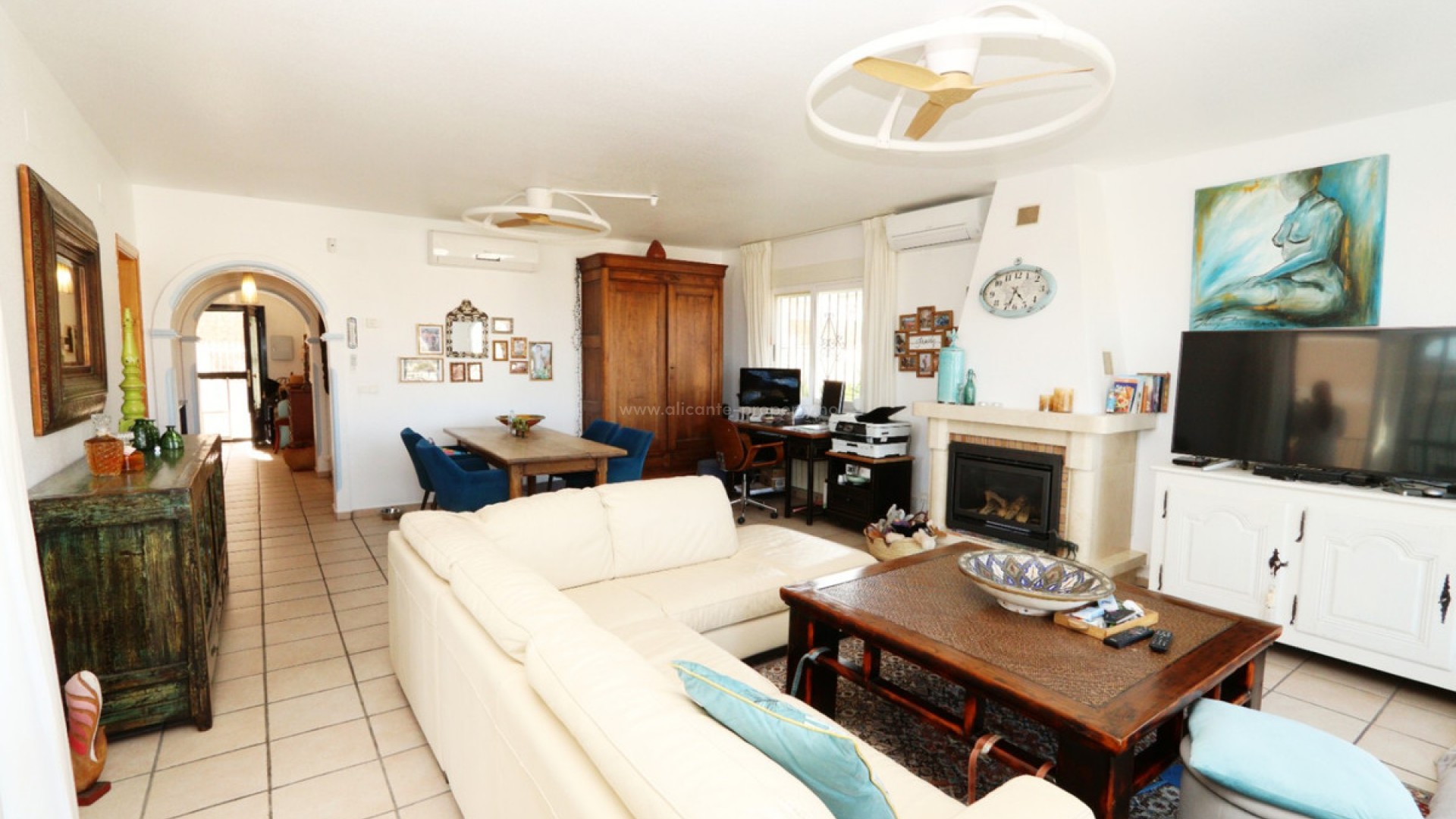 Located in the sought-after area of Bello Horizonte in La Nucia, just outside Altea, this charming family villa is the perfect place to live all year round. The property is distributed over two floors. The main access leads to a large integrated garage and a sunny porch, from which steps lead down to the garden, where you will find orange trees, mature lemon trees and beautiful palm trees. On the entrance level is the master bedroom with en-suite bathroom, a guest toilet, a spacious kitchen, a separate laundry room, and a large living-dining room with fireplace, air conditioning and central heating. Large windows offer spectacular views of the sea, covering Altea, Albir and Calpe. Next to the living room, a stunning terrace with panoramic views becomes the perfect place to enjoy a glass of wine while watching the sunset. The ground floor is accessible from both the inside and the outside, making it an ideal choice for entertaining. This area also has a separate kitchen, as well as 4 more bedrooms (one of them currently fitted out as an art studio), 2 spacious bathrooms and a beautiful terrace overlooking the heated pool area. The low-maintenance gardens, with palm trees, fruit trees and shrubs, create a relaxing atmosphere. The pool is the perfect place to cool off during warm, mild summer nights, and has the added bonus of a poolside Jacuzzi and an outdoor shower. The villa is equipped with solar panels, a battery, a heat pump and an aerothermal energy. Which makes this villa very energy efficient.