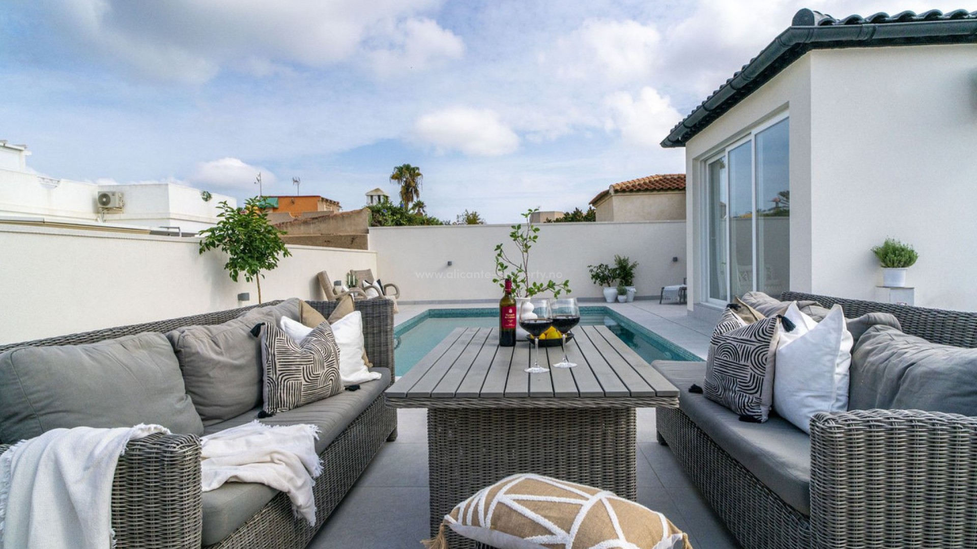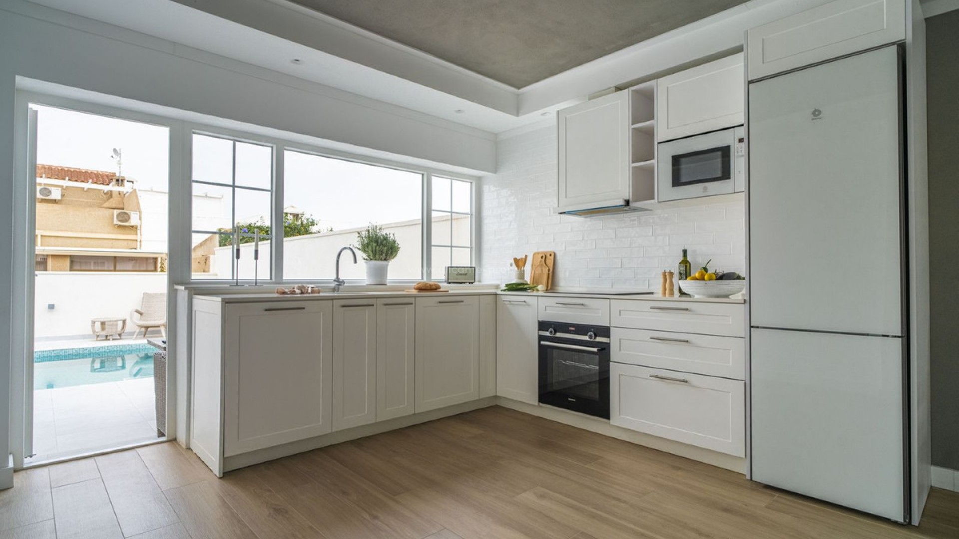 Welcome to this fantastic, fully renovated single-story villa – a dream home for those in search of a modern and elegant residence! Here, sophisticated design and carefully crafted details come together to create a warm and inviting atmosphere. The villa features light colors throughout and large windows that allow for an abundance of natural light, bringing a sense of spaciousness and harmony to the entire home. This spacious villa offers three large bedrooms and two newly renovated bathrooms, combining modern functionality with a touch of refined style. Here, there's room for both relaxing showers and quick morning routines, all with a high standard of quality and carefully selected materials. The outdoor space is a true oasis, with a large pool that becomes a natural gathering spot on sunny days. Imagine enjoying peaceful swims or perhaps a fun pool day with family and friends – this is the perfect place for relaxation and socializing! From the rooftop terrace, you can also enjoy fantastic views of the area and soak up the sun all day. The terrace offers endless possibilities: decorate it with lounge furniture for lovely barbecue nights, create a green oasis with plants and flowers, or set up a cozy corner for your morning coffee. Here, you can truly embrace outdoor living! This villa offers everything you need to create a home that feels like a true retreat. You'll find modern style, light colors, and generous social spaces, both indoors and out. Welcome to your new dream home, where every day feels like a holiday!