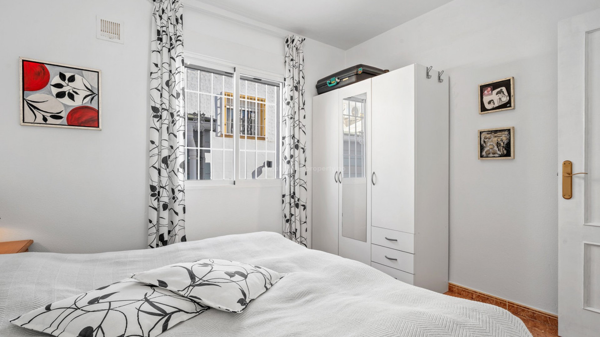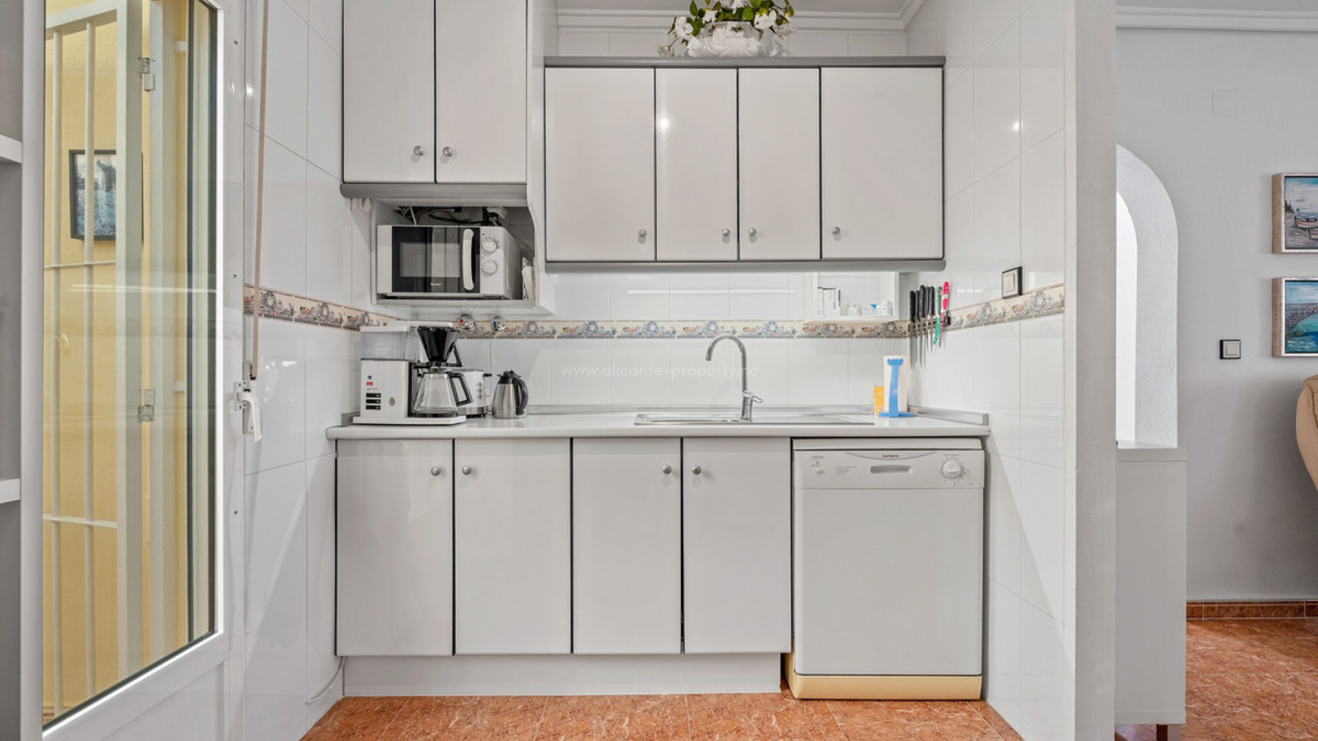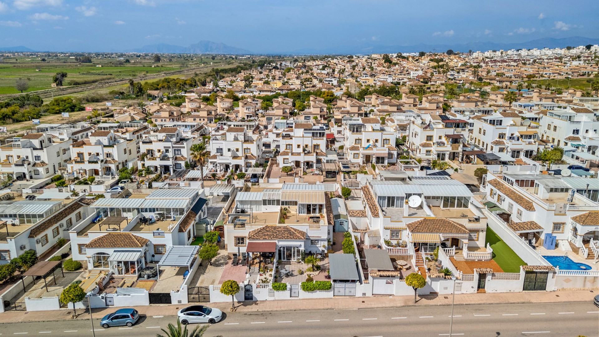 This charming and well-maintained quad house from 2003 is located in the popular area of La Marina and is ready to move into. The property is sold furnished, so you can move straight in and start enjoying life under the Spanish sun. At the entrance to the house, you will find a lovely covered terrace that has been enclosed with glass. This provides an additional living space where you can sit sheltered and enjoy your morning coffee – even during the cooler months. Inside, you are welcomed into a bright and inviting living room with an open-plan connection to the kitchen. There is plenty of space for both a sofa area and a dining table, making this room a natural gathering point for everyday life and guests alike. From the living room, a hallway leads to the property's three bedrooms and the bathroom – all equipped with wardrobes. The bathroom is located at the end of the hallway and features a shower cabin. From the kitchen, there is access to the back of the house, where a practical covered area has been created. Here you will find a functional utility room with both a washing machine and dryer, as well as good storage space. From this area, stairs lead up to the property's beautiful rooftop terrace. The covered area continues over the first part of the rooftop terrace, creating an additional living space that can be used as a conservatory, lounge area, or shaded seating area. The Glazed terrace is especially practical during the winter months. The rooftop terrace itself remains spacious, offering plenty of opportunities to enjoy the sun all day. It is perfect for cozy barbecue evenings and relaxing moments under the stars on the many warm Spanish nights. The plot surrounding the house is very charming and well-designed, featuring fruit trees, small green oases, and several lovely seating areas where you can enjoy the sun throughout the day. There is also a carport on the plot and a practical storage shed. The property has been well cared for and is in very good condition. Air conditioning is installed in the living room and in one of the bedrooms. The property also includes access to a lovely communal pool area with both a large pool with a children's pool. The area is landscaped with real grass, creating a cozy and green atmosphere. There are both parasols and pergolas, making it easy to find shade on hot summer days. It is a wonderful place to spend sunny days – whether you want to take a refreshing dip, relax with a good book, or simply enjoy a day by the pool. The house is located in a quiet and well-established area of La Marina. Restaurants and cafés are within walking distance, while several supermarkets and shopping facilities are under 2 km away. The beautiful sandy beaches of La Marina and Guardamar can be reached in just a few minutes by car – only about 3.5 km away. The area is also known for its cozy atmosphere, great restaurants, and stunning natural surroundings with pine forests and dunes along the coastline. Alicante Airport is approximately 30 km away via the N332, which is easy to access. A wonderful home with great outdoor areas and plenty of possibilities – perfect as a holiday home or for longer stays in Spain.