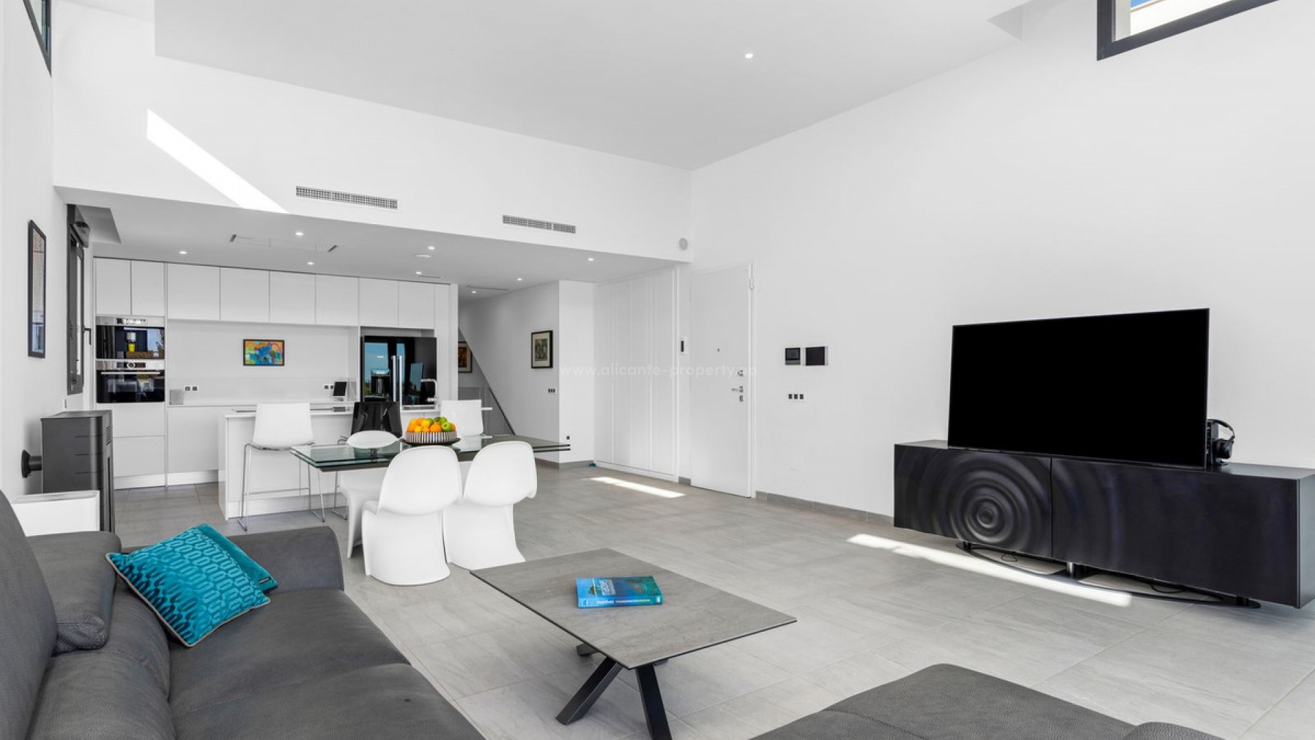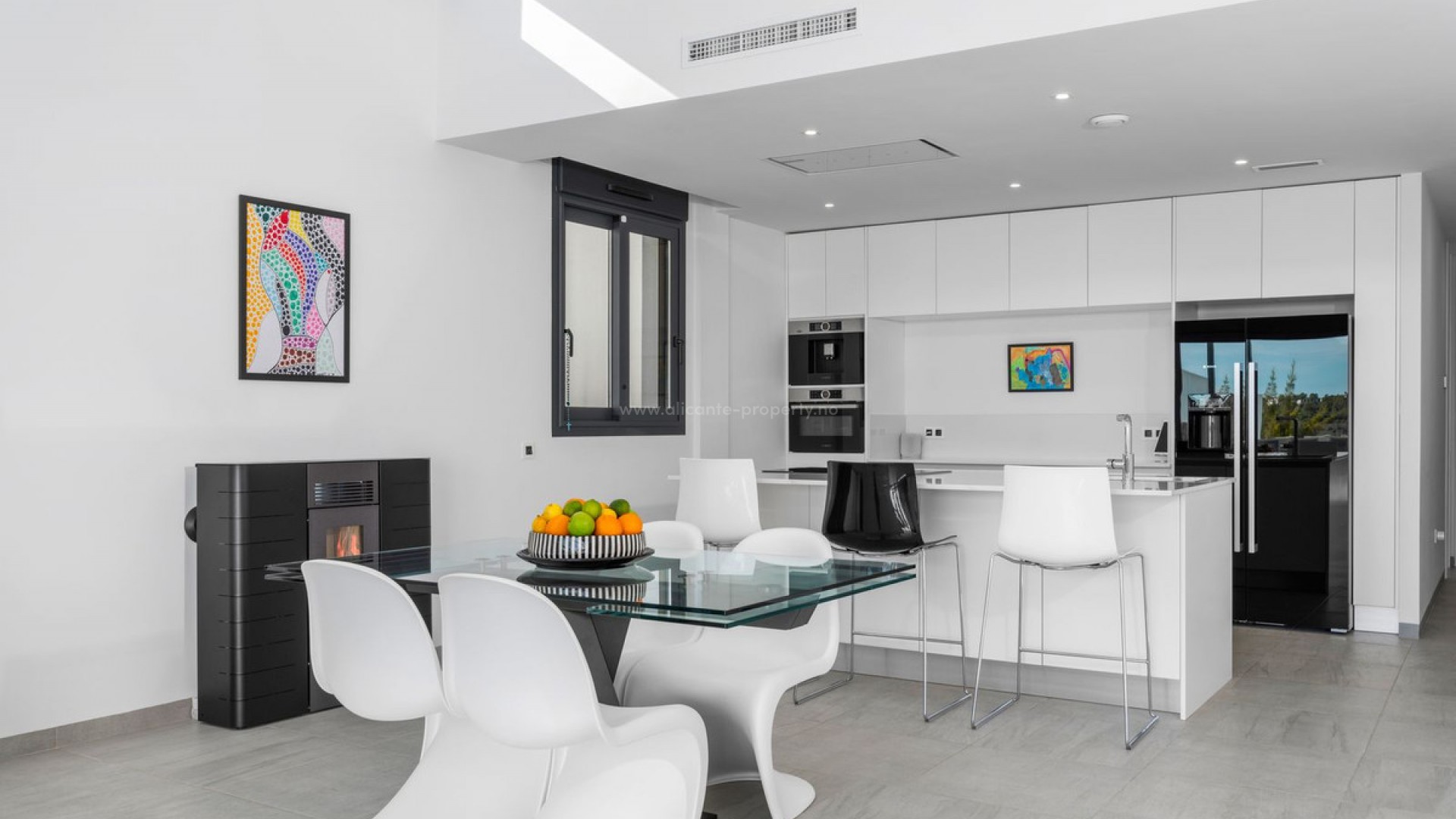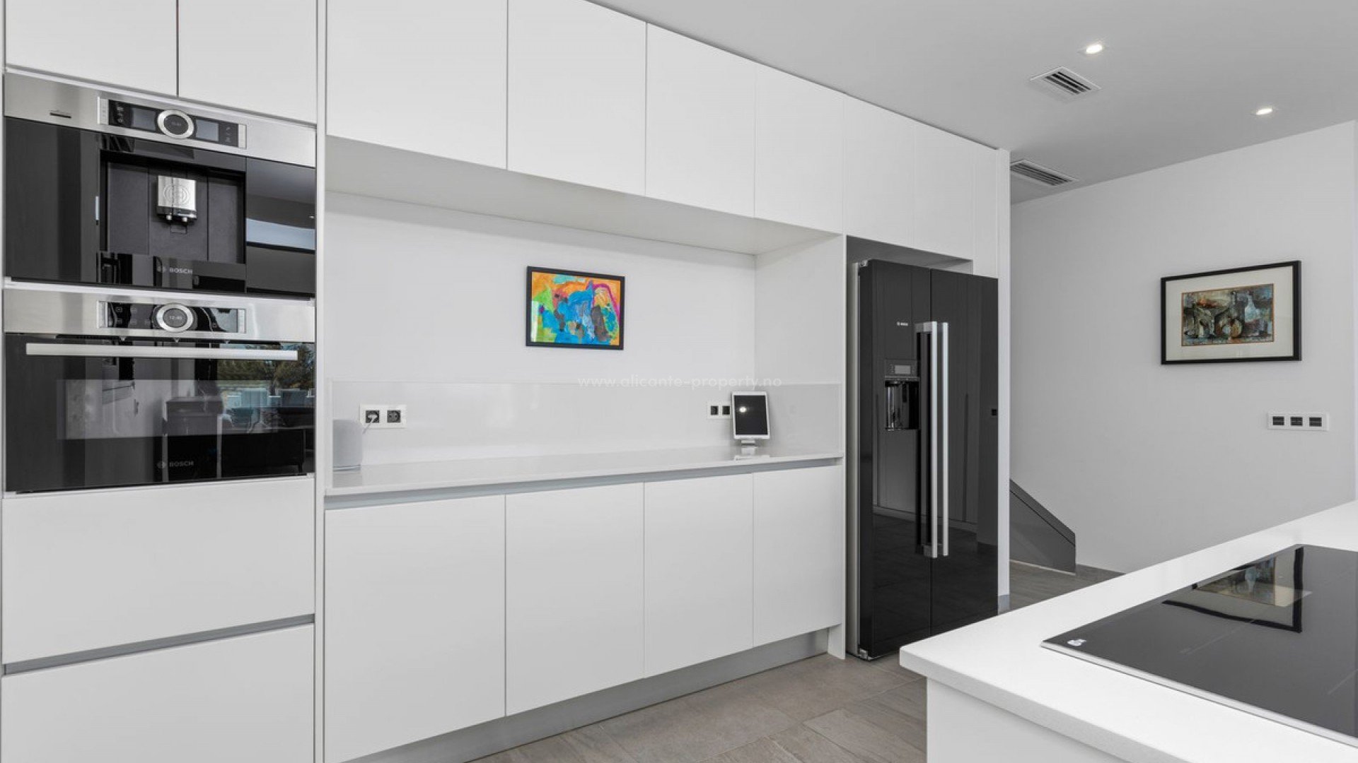 We are proud to present this exclusive top of the range independent villa with spectacular uninterrupted sea views. If you are looking for a home that is high tech and walk in ready, then book your viewing for this amazing property today! As we enter the villa straight into the open plan kitchen/living room you will immediately notice how bright and spacious it is. The 60m² living area has a raised ceiling of 3.5m and has large panoramic sliding doors across the back, which allows you to fully enjoy the amazing sea views. The doors lead out to a large covered terrace and the beautiful newly fitted heated infinity pool with lights and electric cover. Down a few steps to the back of the pool there is a cosy deck where you can sunbathe until the sun goes down. Back inside to the sleek modern kitchen you will be wowed by the technology this villa has. All the appliances are top of the line and can be controlled by your phone, through WiFi Home Connect. That includes the built-in oven, microwave, dishwasher, induction hob, extractor fan and even the coffee machine! All appliances that are built in, will remain. There is even a hidden pop-up plug stand built into the island. Beside the front door are hidden storage cupboards, ideal for coats, shoes and much more. As we continue to explore this level you will find a separate large fully tiled cloakroom and the bright master bedroom with a large dressing area and a sleek master ensuite with double sinks and glazed walk-in shower. Large sliding doors in the master bedroom lead out to the rear garden with a grassed seating area. As you walk down the stairs, you immediately arrive at the second living room, currently being used as a home gym and play area for children. Patio doors lead out to a lovely courtyard area which is also accessed via all the bedrooms. On this level there are 3 more fabulous bedrooms to explore. The first is currently being used as a spacious office. The next bedroom has built in wardrobes, patio doors to the courtyard and a high end modern ensuite. The last bedroom is a beautiful suite, comparable to a 5 star hotel room, with endless fitted wardrobes, a gorgeous ensuite with freestanding bath and walk-in shower, as well as patio doors off the bedroom leading to the afore mentioned courtyard. But that's not all there is down here, leading off the living room is a very spacious laundry and utility room which also gives access to an enormous storage room. Throughout the house there is hot and cold air conditioning which can be controlled in 5 different Daikin air zones by the control panels or by your phone. This stunning villa has even more to offer: Top of the line water softener has been fitted throughout, including the swimming pool. The main level living room has a pellet warmer to help create those extra cosy nights. There are mosquito nets and electric shutters throughout the entire property. Every bathroom has radiators, underfloor heating and extractor fans. The electric gate leads to the private driveway with parking for 3 cars and a brand new unused electric car charger. The pedestrian gate has a video doorbell with internal opener. Up on the 60m2 solarium you will find 22 solar panels. New privacy fencing has been installed. Exterior lighting and 5 security camera points around the property. This luxury villa really is walk in ready and is waiting to wow you! This stunning villa is less than a 5 minutes' drive from the vibrant town of San Miguel de Salinas where you can find all the amenities that you require. Sought after Spanish schools, 24hr medical centre, church square, banks, pharmacies, municipal pool, football ground and a fantastic selection of local and international bars and restaurants. As a Spanish town it celebrates the many colourful fiestas throughout the year and there is a weekly produce market on a Wednesday. If golf is on your agenda, then you will not be disappointed with the award winning Las Colinas golf course only a few minutes' drive, and a further 4 prestigious golf courses less than a 10-minute drive. The fabulous sandy coast line of the Orihuela Costa is 12 minutes away by car as is a very popular and large shopping mall, Zenia Boulevard, where you can shop to your hearts content. Community Fees: €39 / monthly. Basura Tax: €75 / annually. IBI Fees: €770 / annually