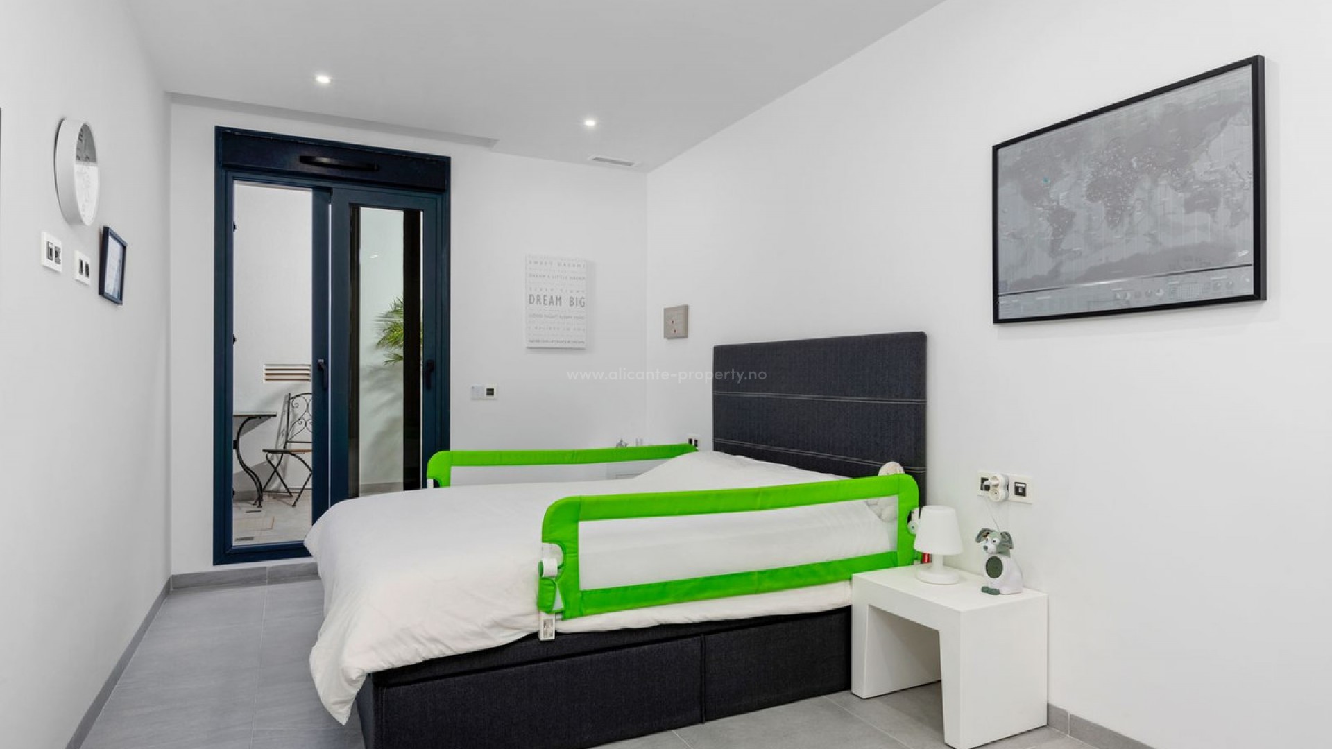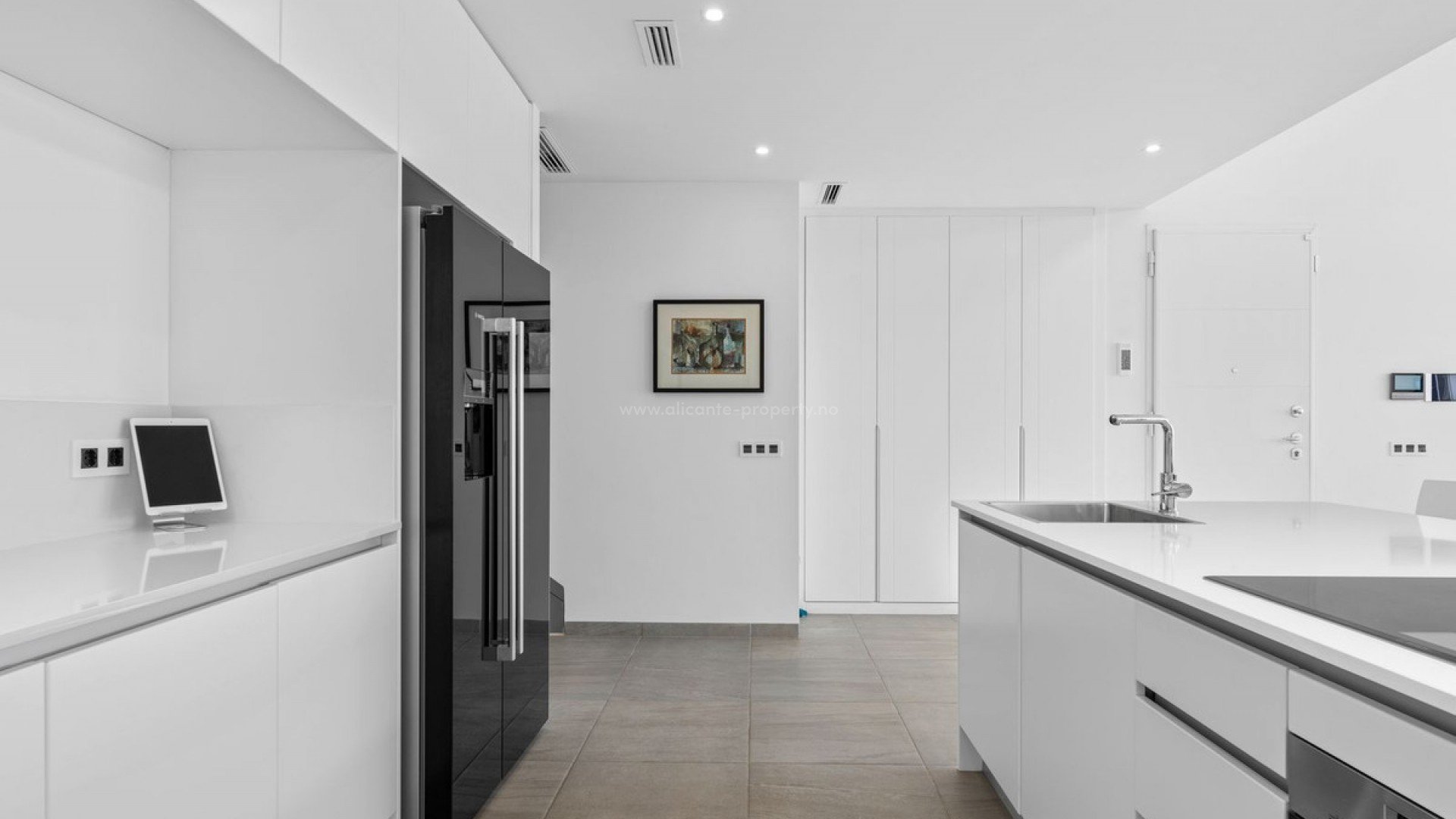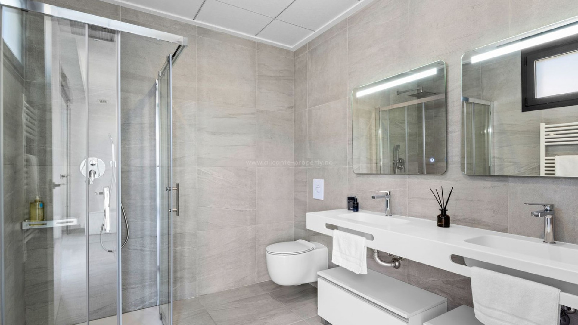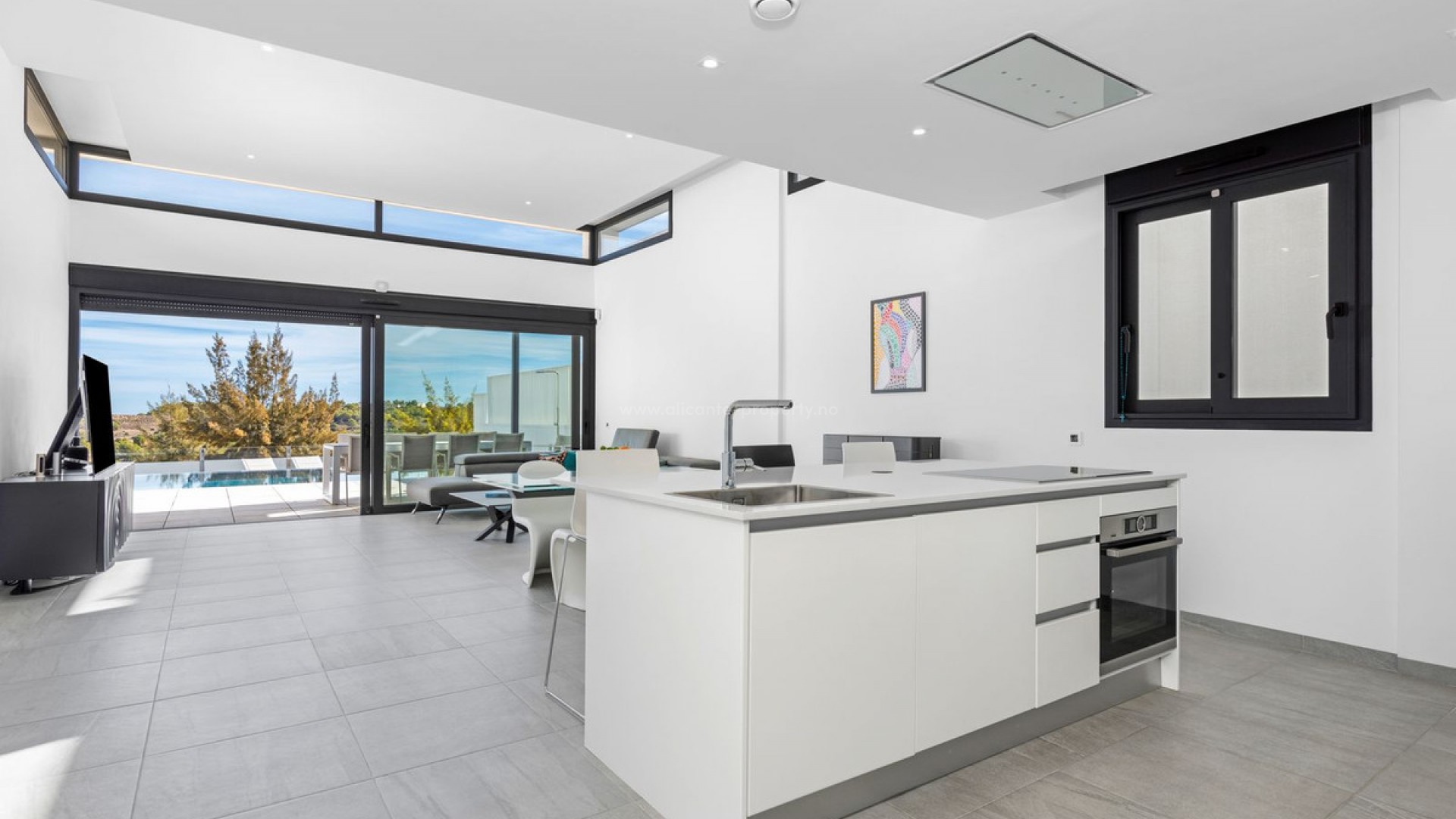We are proud to present this exclusive top of the range independent villa with spectacular uninterrupted sea views. If you are looking for a home that is high tech and walk in ready, then book your viewing for this amazing property today! As we enter the villa straight into the open plan kitchen/living room you will immediately notice how bright and spacious it is. The 60m² living area has a raised ceiling of 3.5m and has large panoramic sliding doors across the back, which allows you to fully enjoy the amazing sea views. The doors lead out to a large covered terrace and the beautiful newly fitted heated infinity pool with lights and electric cover. Down a few steps to the back of the pool there is a cosy deck where you can sunbathe until the sun goes down. Back inside to the sleek modern kitchen you will be wowed by the technology this villa has. All the appliances are top of the line and can be controlled by your phone, through WiFi Home Connect. That includes the built-in oven, microwave, dishwasher, induction hob, extractor fan and even the coffee machine! All appliances that are built in, will remain. There is even a hidden pop-up plug stand built into the island. Beside the front door are hidden storage cupboards, ideal for coats, shoes and much more. As we continue to explore this level you will find a separate large fully tiled cloakroom and the bright master bedroom with a large dressing area and a sleek master ensuite with double sinks and glazed walk-in shower. Large sliding doors in the master bedroom lead out to the rear garden with a grassed seating area. As you walk down the stairs, you immediately arrive at the second living room, currently being used as a home gym and play area for children. Patio doors lead out to a lovely courtyard area which is also accessed via all the bedrooms. On this level there are 3 more fabulous bedrooms to explore. The first is currently being used as a spacious office. The next bedroom has built in wardrobes, patio doors to the courtyard and a high end modern ensuite. The last bedroom is a beautiful suite, comparable to a 5 star hotel room, with endless fitted wardrobes, a gorgeous ensuite with freestanding bath and walk-in shower, as well as patio doors off the bedroom leading to the afore mentioned courtyard. But that's not all there is down here, leading off the living room is a very spacious laundry and utility room which also gives access to an enormous storage room. Throughout the house there is hot and cold air conditioning which can be controlled in 5 different Daikin air zones by the control panels or by your phone. This stunning villa has even more to offer: Top of the line water softener has been fitted throughout, including the swimming pool. The main level living room has a pellet warmer to help create those extra cosy nights. There are mosquito nets and electric shutters throughout the entire property. Every bathroom has radiators, underfloor heating and extractor fans. The electric gate leads to the private driveway with parking for 3 cars and a brand new unused electric car charger. The pedestrian gate has a video doorbell with internal opener. Up on the 60m2 solarium you will find 22 solar panels. New privacy fencing has been installed. Exterior lighting and 5 security camera points around the property. This luxury villa really is walk in ready and is waiting to wow you! This stunning villa is less than a 5 minutes' drive from the vibrant town of San Miguel de Salinas where you can find all the amenities that you require. Sought after Spanish schools, 24hr medical centre, church square, banks, pharmacies, municipal pool, football ground and a fantastic selection of local and international bars and restaurants. As a Spanish town it celebrates the many colourful fiestas throughout the year and there is a weekly produce market on a Wednesday. If golf is on your agenda, then you will not be disappointed with the award winning Las Colinas golf course only a few minutes' drive, and a further 4 prestigious golf courses less than a 10-minute drive. The fabulous sandy coast line of the Orihuela Costa is 12 minutes away by car as is a very popular and large shopping mall, Zenia Boulevard, where you can shop to your hearts content. Community Fees: €39 / monthly. Basura Tax: €75 / annually. IBI Fees: €770 / annually