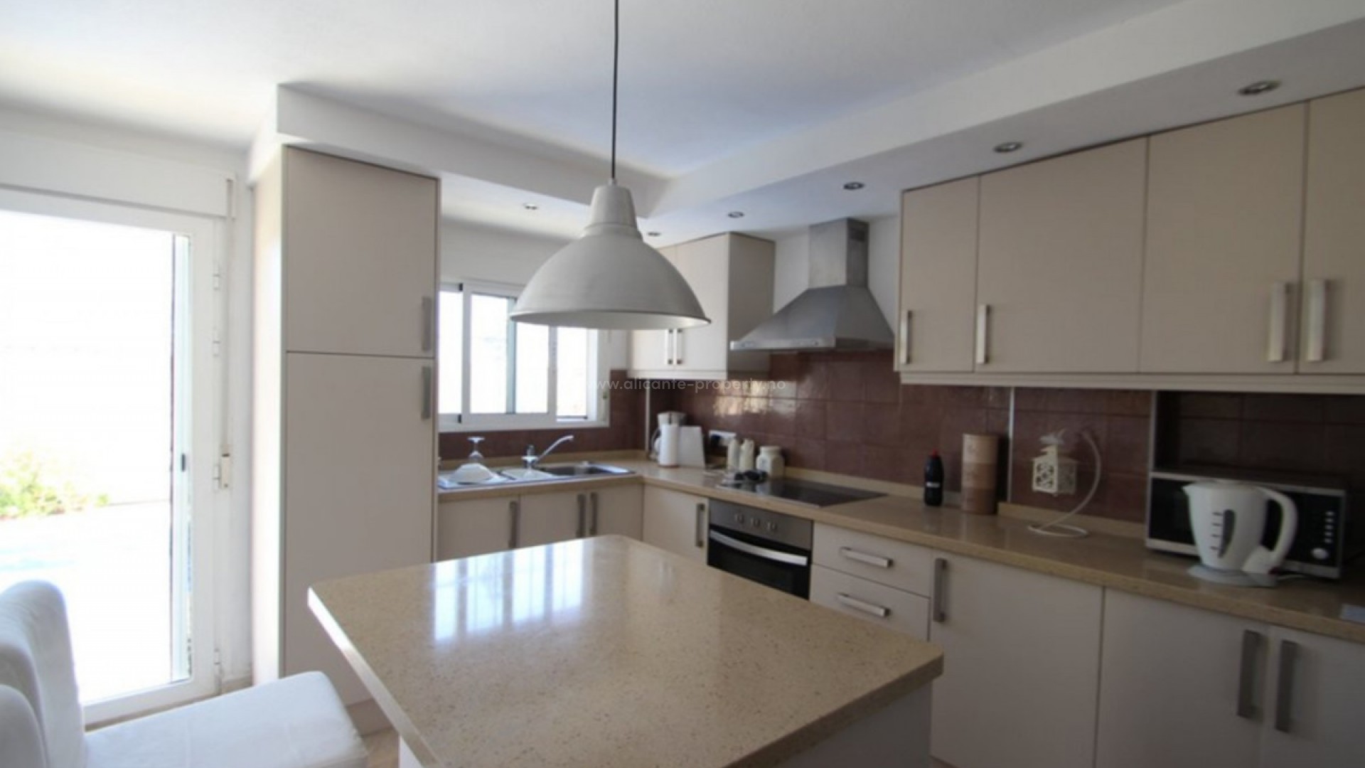 Beautiful detached 4-bedroom with private swimming pool and underbuilt apartment in Villamartin, Alicante This beautiful family home offers in the main living area three double bedrooms, family bathroom, toilet, cloakroom, spacious lounge/dining room, fully fitted kitchen with breakfast bar and storage area. The villa also boasts a private under build apartment with direct access to the pool area and offers double bedroom, spectacular bathroom, sleek and modern open plan kitchen with breakfast bar and spacious lounge/dining area. Outside space boasts numerous terraces, wrap around balcony, established garden and private swimming pool (8x3). To be sold furnished including white goods, security shutters, grilles, air conditioning, satellite TV, gas fire and much more. Located in a quiet residential area and just a short drive to the popular Villamartin Plaza, several golf course and numerous white sandy beaches on the Orihuela Costa.