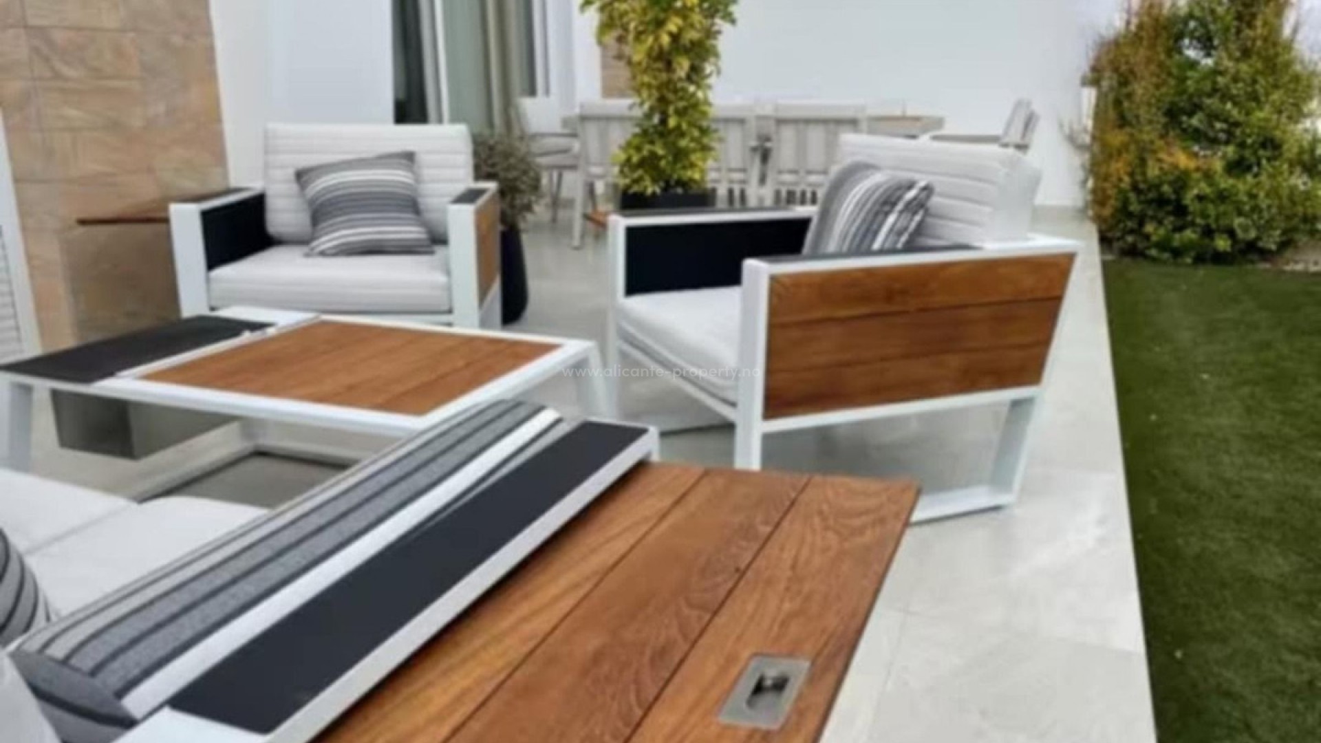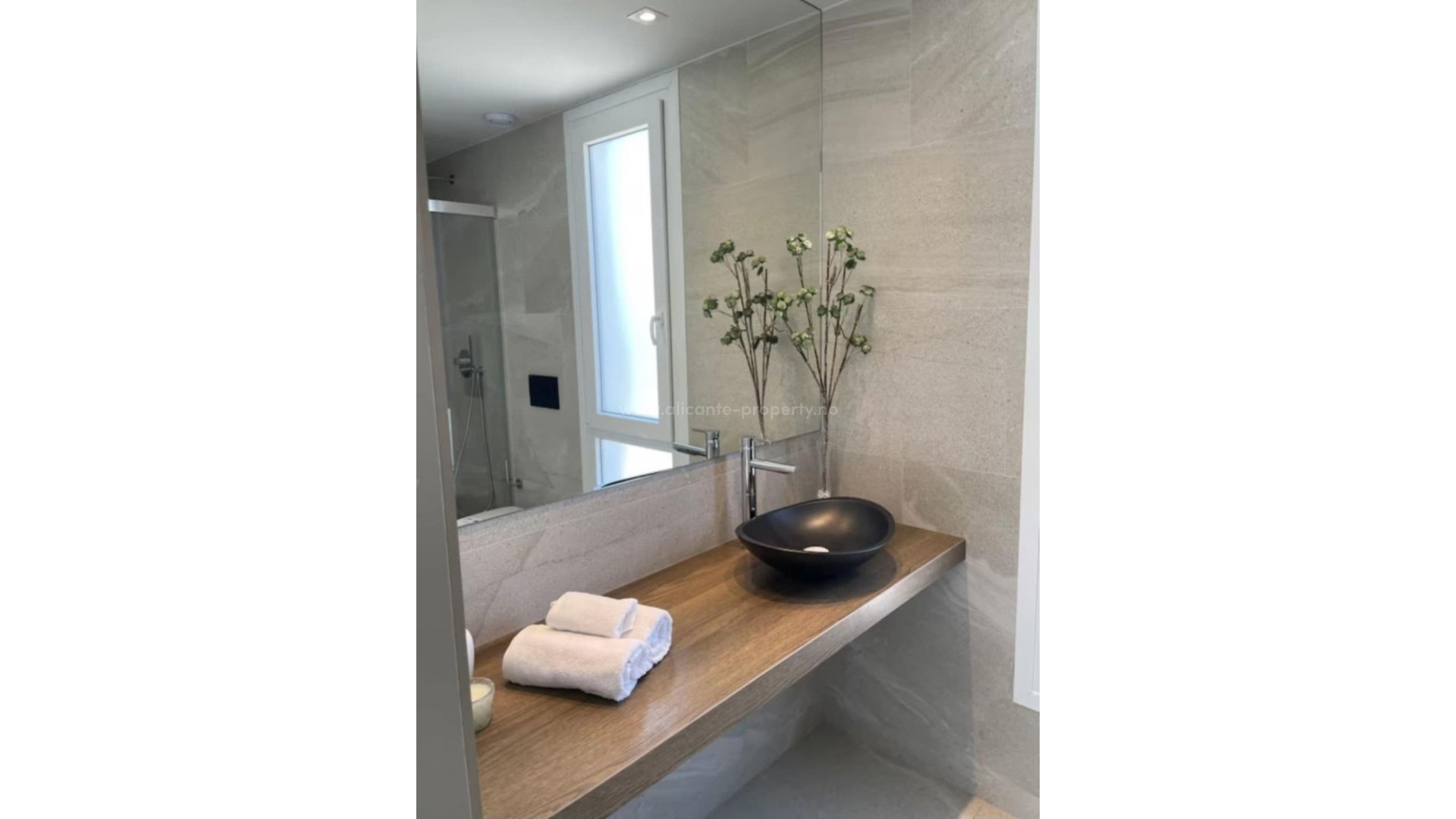 Perfect location, magnificent scenery, mountain views, close to the beautiful beaches of the Costa Blanca. A paradise for golfers, walkers, cyclists or anyone who enjoys the fresh air. Sold as new, with 200m² of living space, modern design and perfect finishes. 3 levels, 4 bedrooms sleeping 8, 1 office for teleworking (possibility of a 5th bedroom), 3 bathrooms and 3 WCs. Fully air-conditioned, underfloor heating for cooler periods. Ground floor: Superb kitchen opening onto the living room (lounge/dining room), 1 large bedroom, 1 bathroom and 1 office that could be converted into an additional bedroom and a utility room. Upstairs: A fully-equipped master suite (bedroom and bathroom) is available on the 1st floor with access to the balcony. Basement: kitchen opening onto a large dining room and spacious lounge, 2 bedrooms, 1 bathroom and a beautiful patio with exotic plants giving access to the swimming pool and offering independent access. Large outside terrace covered by an automatic solar awning has a dining table for 8 people and a lounge. The villa is sold fully equipped with reversible air conditioning. The garden is fully landscaped and maintained by a private company. For your convenience, an intercom is available at the entrance to the villa. Parking space. On the estate, 2 large communal swimming pools, one with a Jacuzzi, 3 new children's play areas, 1 basketball court, picnic tables, restaurants, pharmacy, cash point, bars, large Sunday morning market, privileged access to the estate's sports club and Club House Spa.