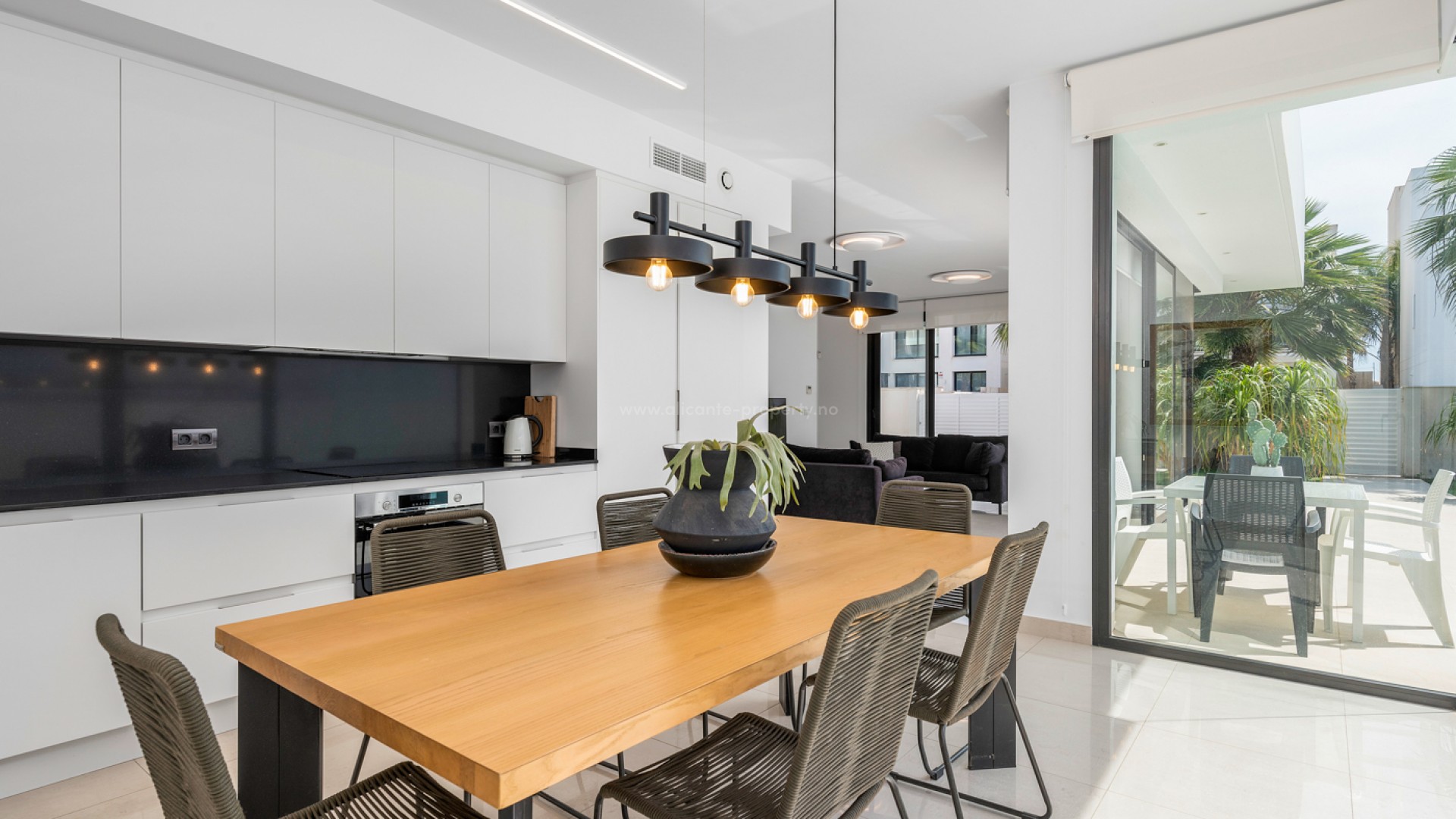 The villa is located in a quiet part of Ciudad Quesada, several kilometers from the coast. The area of the plot on which the property is located is 400 m2, and the living area of the villa itself is 185 m2 and consists of two floors - the ground floor and the first floor. On the ground floor there is a spacious living room, dining room with kitchen, laundry room, 2 bathrooms and a bedroom. Both the living room, kitchen and dining room have a view of the garden and the pool, which makes this part of the house wonderfully lit and the interior is very bright. Access to the first floor is via stairs and there are 2 bathrooms, 3 bedrooms and 2 large terraces which can be accessed from two independent bedrooms. The house is fully equipped, with very good quality furniture, household appliances and bathroom fixtures, and the entire property is also air-conditioned. The villa has been decorated in a modern style, and thanks to many glazing and accessories, its interior is spacious and cozy at the same time. Outdoor area Around the property there is a wonderfully decorated garden, which is distinguished by numerous and green plants, a well-kept terrace, a swimming pool and a parking plot. On the terrace you can relax on the sun loungers and eat your meals. There are also 2 large balconies on the first floor overlooking the surroundings of Ciudad Quesada. Area Ciudad Quesada is a cozy and popular place on the Costa Blanca coast. Here you will find shops, restaurants, cafes, bars, pharmacies, banks, hairdressers, medical and dental services and much more. In the main street it has recently been built a cozy shopping mall with several shops. Ciudad Quesada also offers several activities for the whole family, such as the famous La Marquesa golf course, bowling, mini golf, tennis courts, soccer fields, gyms, spas, seasonal water park and much more. BeachesThe magnificent beaches of the Costa Blanca coast lie like pearls on a string, and within a short distance you can access a number of beaches. The famous 9 kilometer long sandy beach in Guardamar del Segura and the "Torrelamata" beach in La Mata are the two nearest beaches, located about a 10-15 minute drive from Ciudad Quesada. ClimateCiudad Quesada is an ideal place to live and a lovely place to spend the summer. The summers are always sunny and warm, while winters are mild, and the area has an average temperature of 20 degrees. Ciudad Quesada is surrounded by two large salt lakes which have a cleansing effect on the air and help to give the area a particularly favorable health environment. The climate has especially a positive effect on people with ia asthma, allergies, rheumatism and skin diseases. According to medical science, the area belong to one of the healthiest places in the world thanks to the salt lakes. ShoppingIn Ciudad Quesada you will fin a number of shops, supermarkets, restaurants and bars. In Torrevieja, which is approximately 10 minutes away by car, you will find the shopping center Habaneras and Carrefour. In Torrevieja there is also a shopping street with a variety of shops. 10 kilometers away is the large shopping center Zenia Boulevard, where you will find a huge variety of shops, like Zara, Massimo Dutti, H&M, Stradivarius, Oysho, Mango, Primark, Pull & Bear, Decathlon, Guess, Kiko, Druni, Rituals, Leroy Merlin and many more. GolfIn Ciudad Quesada you will find the well-known golf course "La Marquesa Golf & Country Club". There are a number of golf courses nearby and within a radius of 15 kilometers you will find Las Colinas Golf & Country Club, La Finca Golf, Golf Las Ramblas Golf Villamartín, Lo Romero Golf, Vistabella Golf, Real Clud de Golf Campoamor and Greenlands Golf. Yachtin and water sportsWithin a radius of 20 kilometers there are several yacht clubs and marinas. In Torrevieja you will find three, while there is one in Guardamar del Segura and two in Santa Pola. Here you will find sailing schools, windsurfing and diving schools, to mention some. Several places in the area you can rent boards for SUP (stand up paddle-boarding), and a number of beaches offer water activities like fly-boarding, banana boats, jet skis and more. Hospitals and healthcareIn Torrevieja there is a modern public hospital with an excellent reputation. Hospital Quiron is a private hospital, and this is also located in Torrevieja. Laguna Mar Menor, which is about a 30 minute drive from Ciudad Quesada, is one of Europe's largest salt water lagoons with a maximum depth of approximately 7 meters. The high water salinity provides a microclimate that is very healthy, particularly for people with heart problems, arthritis or lung diseases. The saline mud bath is also famous for its relief of skin diseases such as psoriasis, and is recommended by several specialists. Getting thereCiudad Quesada is located approximately 40 minutes by car from both the airport in Alicante and Murcia / San Javier. From Ciudad Quesada one can easily reach major cities in the area through the A-7 motorway or the coastal highway N-332, such as Elche, Alicante, Valencia, Murcia and Cartagena to name a few.