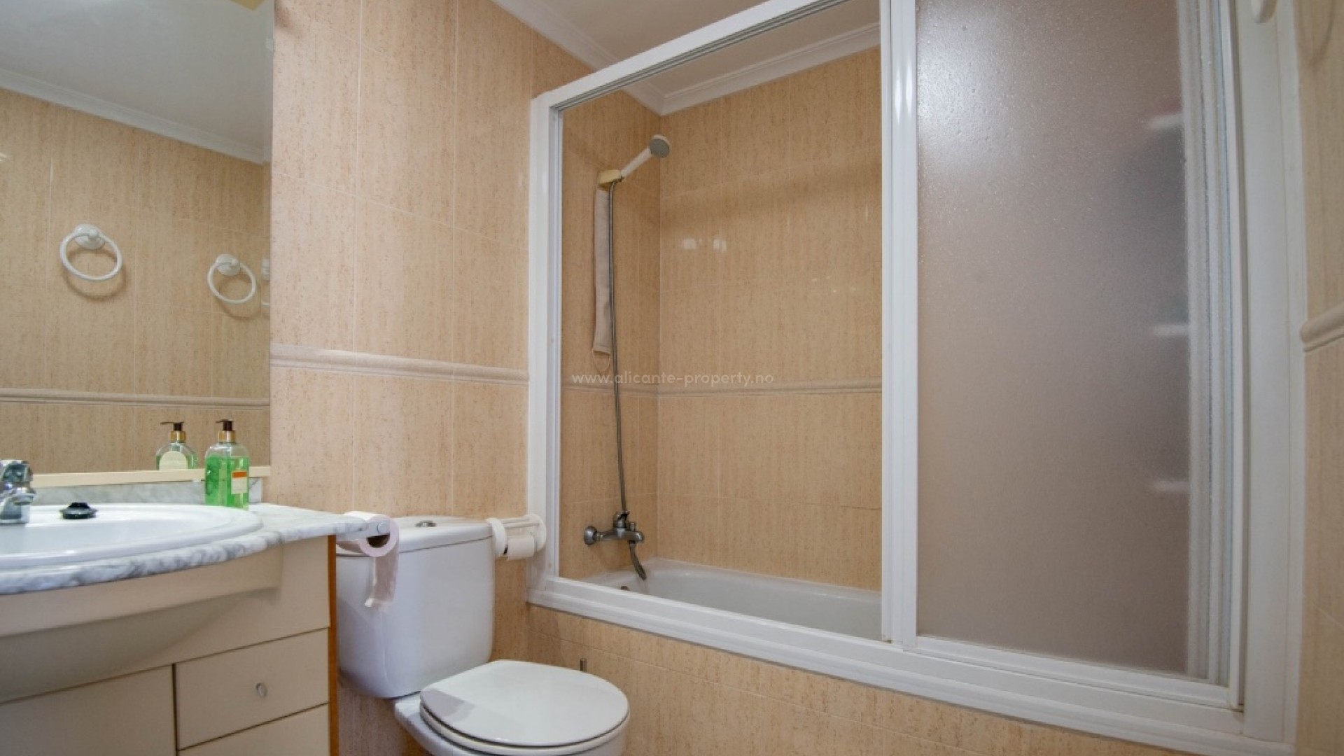 For sale 3 bedroom townhouse in Zeniamar, Orihuela Costa Zeniamar is known for its peaceful atmosphere, charming palm-lined walkways, and its own small shopping centerwith cafés, restaurants, and essential services. Everything you need is within walking distance — the nearest Carrefour supermarket is only about 1 km away, and the Mediterranean Sea is less than 2 km from your door. Nearby you'll also find both Scandinavian and Spanish schools, as well as the Orange Padel Center, making this location ideal for both permanent living and investment. The apartment offers 89 m² of living space, with a bright and airy open-plan kitchen and living area leading to a sunny southwest-facing terrace and private garden – perfect for enjoying the Mediterranean climate year-round. Property features: 3 bedrooms with built-in wardrobes2 bathroomsModern open-plan kitchenSpacious and bright living roomSouthwest-facing terrace and private gardenAir conditioning for cooling and heatingIn excellent condition – ready to move in The residential complex features well-maintained green areas and a beautiful communal swimming pool, ideal for relaxation and leisure.
