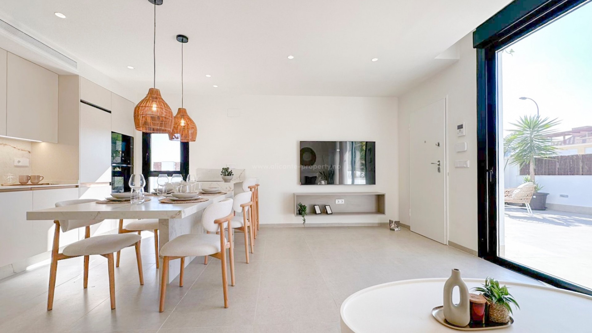 Te presentamos esta atractiva vivienda, recientemente reformada, diseñada para disfrutar del estilo de vida mediterráneo con comodidad, luminosidad y espacios exteriores pensados para aprovechar el clima durante todo el año. La propiedad cuenta con 73 m² construidos (59 m² útiles) distribuidos de forma funcional. Dispone de dos dormitorios con armarios empotrados y dos baños, ofreciendo un espacio cómodo tanto como residencia habitual, segunda vivienda o inversión. La zona de día se compone de un luminoso salón-comedor con cocina integrada de estilo contemporáneo, un espacio abierto que conecta con el exterior y que destaca por su amplitud y entrada de luz natural. En el exterior encontramos una parcela de 200 m² con jardín privado y piscina, ideal para relajarse y disfrutar del buen tiempo. La zona de piscina cuenta además con ducha exterior. En la planta superior, la vivienda dispone de un amplio solárium con pérgola, perfecto para crear una zona chill-out o comedor al aire libre con total privacidad. La vivienda está equipada con aire acondicionado, calefacción individual, persianas eléctricas, puerta de acceso para coche automatizada y trastero. Su orientación sur y oeste garantiza una excelente luminosidad durante gran parte del día. Una propiedad moderna, reformada y lista para entrar a vivir, ubicada a pocos minutos de la costa y de todos los servicios de Santiago de la Ribera.