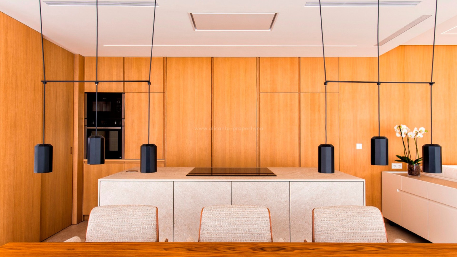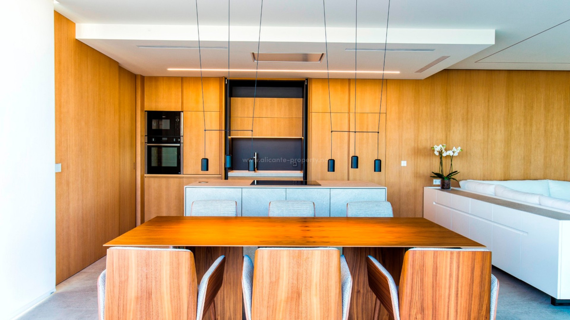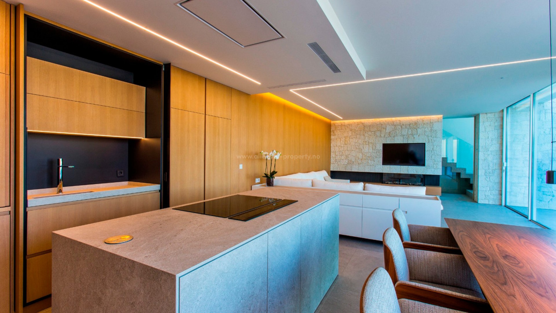Ubicada en el tranquilo barrio de La Fustera de Benissa, esta impresionante villa construida en 2023 ofrece una mezcla de lujo contemporáneo y encanto mediterráneo. A un corto paseo de la playa y a un corto trayecto en coche de los animados centros de Calpe y Moraira, este refugio orientado al sureste ofrece impresionantes vistas al mar desde su parcela elevada de 800 m². Con 355 m² distribuidos en tres niveles cuidadosamente diseñados, esta casa es un paraíso de estilo y confort. El corazón de la villa es su espaciosa sala de estar de planta abierta, donde una cocina gourmet con elegantes armarios blancos y detalles en madera natural fluye a la perfección hacia un luminoso salón. Las amplias puertas correderas de cristal enmarcan la piscina infinita y los cuidados jardines, invitando al exterior e inundando el espacio de luz solar. La terraza exterior, perfecta para comer al aire libre, ofrece vistas a la costa azul, creando un entorno idílico para la relajación. Esta residencia cuenta con cuatro amplios dormitorios y cinco cuartos de baño elegantemente decorados, incluida una lujosa suite principal con vistas panorámicas. Cada detalle refleja calidad, desde los pulidos acabados hasta la abundante luz natural. El nivel inferior ofrece un espacio versátil, iluminado por un patio hundido, ideal para un gimnasio en casa, oficina o zona de entretenimiento, complementado por un garaje seguro y dos plazas de aparcamiento adicionales.Diseñada para la vida moderna, la villa está equipada con tecnología de vanguardia, como un sistema de domótica inteligente, calefacción por suelo radiante de bajo consumo, climatización avanzada y acristalamiento de alto rendimiento para ofrecer confort durante todo el año. La gestión remota de la iluminación y la temperatura garantiza una comodidad sin esfuerzo. Totalmente amueblada y lista para disfrutar, esta joya de Benissa redefine la elegancia costera, combinando un diseño sofisticado con el encanto relajado de la Costa Blanca. Perfecto para aquellos que buscan una casa llave en mano donde el lujo se une a la tranquilidad.