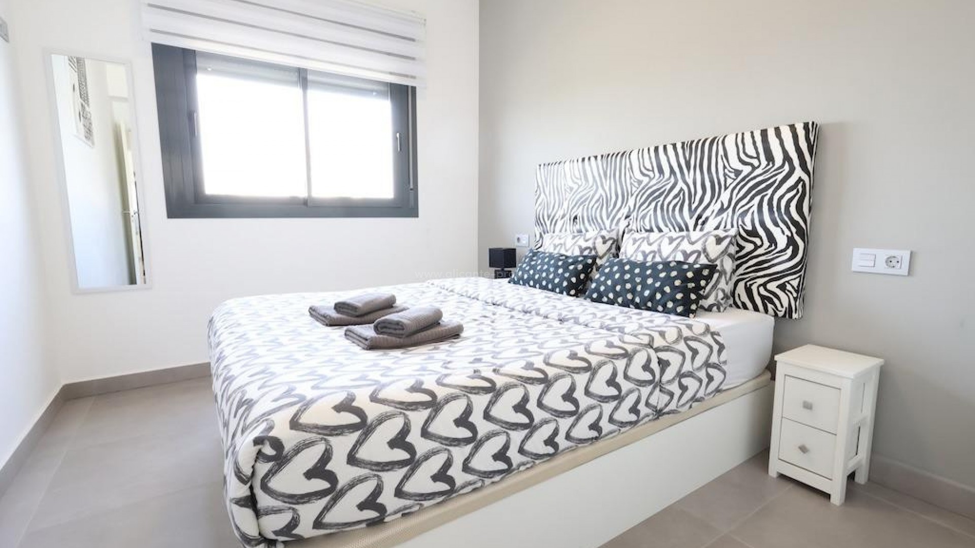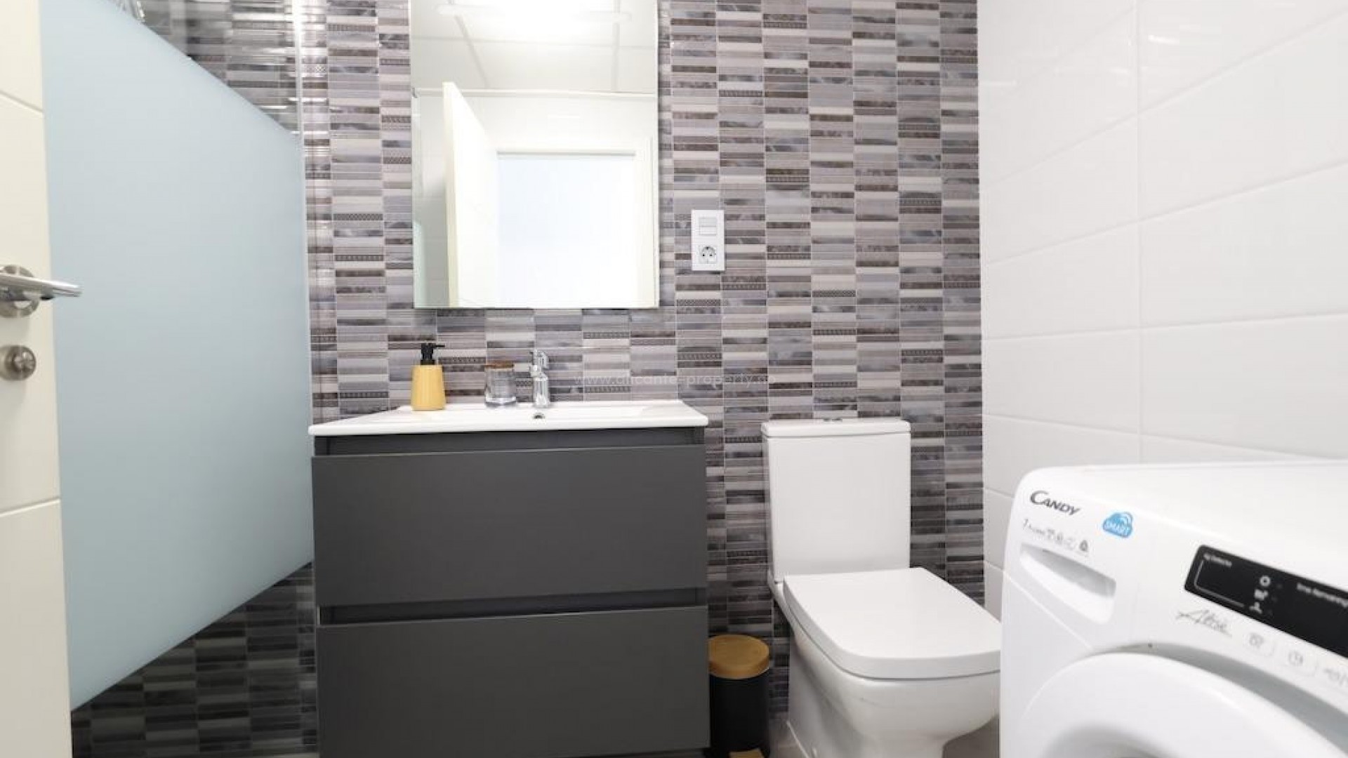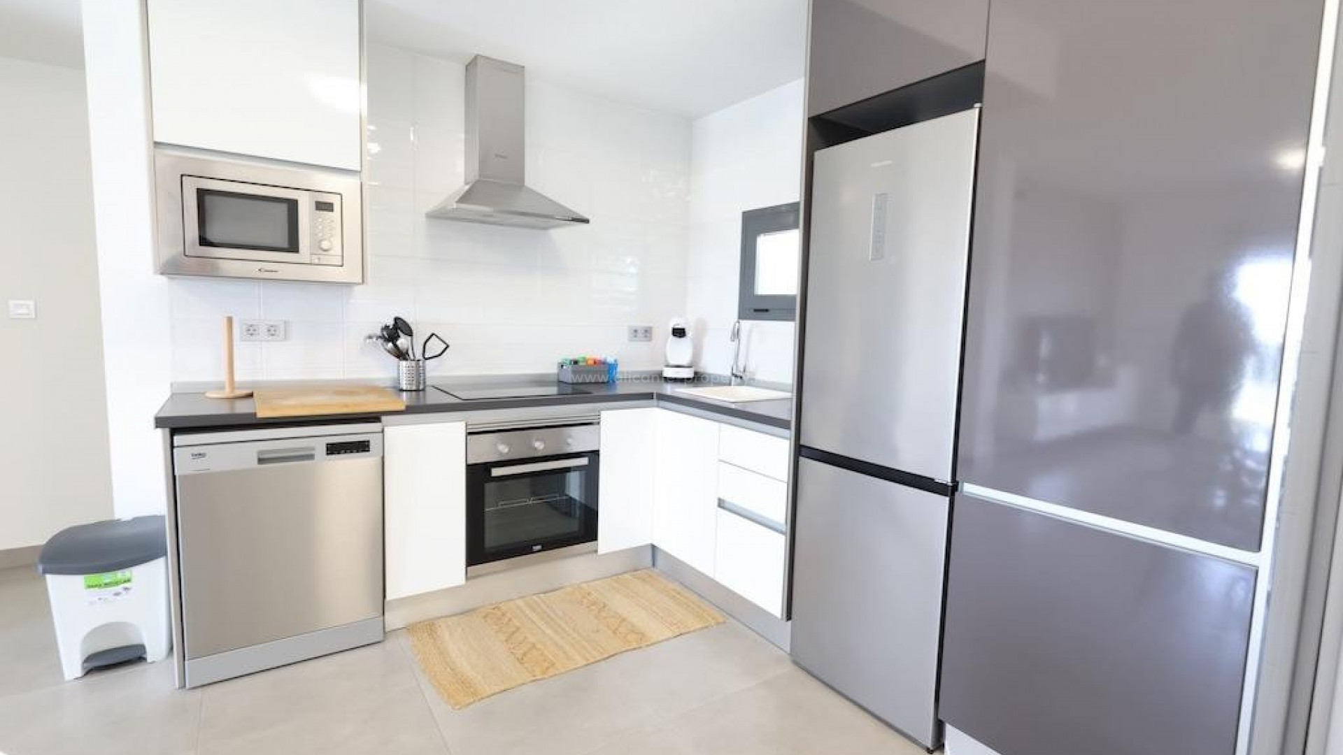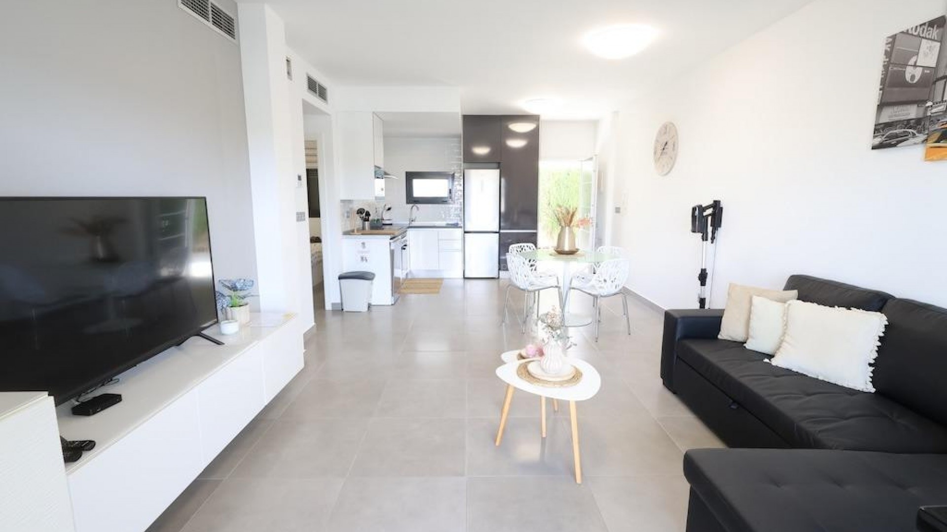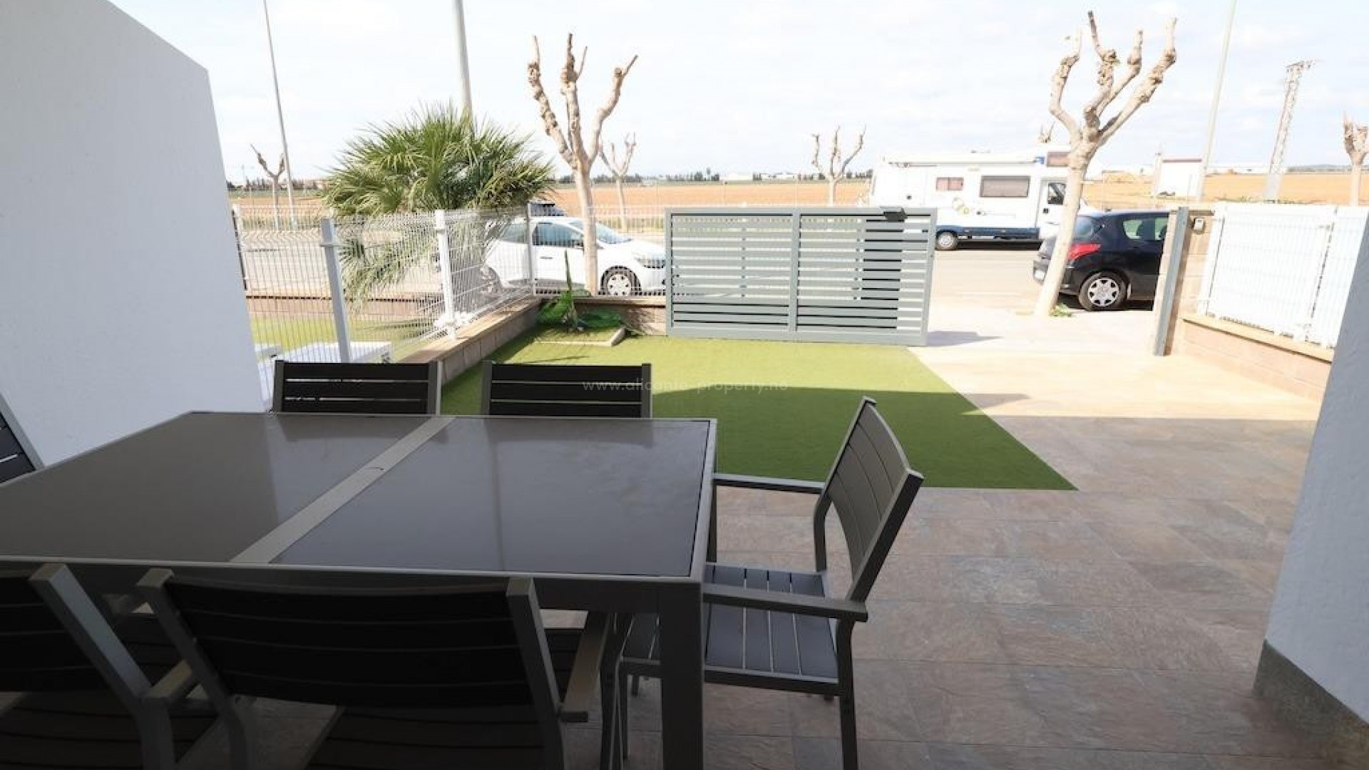 La Mar Fase III, Pilar de la Horadada, Bungalow en planta baja de 70 m2 con 2 dormitorios, 1 baño, amplio salón comedor con cocina incorporada al salón, terraza y un jardin enlosado de 30 m2 con entrada para el coche, la vivienda se vende amueblada con aire acondicionado central por conductos, el residencail cuenta con piscina comunitaria.