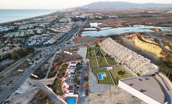 RESIDENCIAL DE OBRA NUEVA EN VERA Residencial de apartamentos de nueva construcción en Vera a tan solo 400m de la inmensa playa de Vera llamada "El Playazo". Las tipologías son de planta baja con dos jardines privados, uno en cada orientación, lo que permite disfrutar del sol o de la sombra siempre que se quiera dependiendo de la hora del día o de la época del año. Las primeras plantas tienen terrazas y los áticos cuentan con grandes solariums. Todos los apartamentos tienen techos de altura extra (2,95 m) que proporcionan una gran sensación de amplitud. La cocina se entrega totalmente amueblada y equipada integrada con el salón-comedor con zona de barra. Las puertas y armarios empotrados están lacados en blanco y el suelo es de madera laminada. El aire acondicionado frío-calor y el agua caliente son generados por un dispositivo aerotérmico DAIKIN de última generación, una tecnología que ahorra hasta un 70% del consumo eléctrico en comparación con los sistemas tradicionales. Todos los cuartos de baño disponen de ducha en lugar de bañera, con espejos empotrados y también con encimera de piedra y mampara de cristal en el baño principal. Las persianas del salón y del dormitorio principal son eléctricas, herméticas y con lamas regulables. Los jardines y el solarium se entregan con los suelos acabados combinando césped artificial y un bonito pavimento imitando madera. Cada vivienda incluye una plaza de aparcamiento exterior privada. Cada bloque de la promoción dispone de un ascensor independiente. Tanto los edificios como las viviendas tienen una serie de características de arquitectura bioclimática (orientación, aislamiento, ventanas y persianas, pérgolas) que permiten una óptima regulación natural de la ventilación, la temperatura y la luz a lo largo de las diferentes estaciones del año. Las zonas comunes están formadas por plazas peatonales y zonas verdes, con una gran piscina para adultos y otra para niños en la plaza central. Toda la urbanización está libre de barreras arquitectónicas para discapacitados. Aquí la tranquilidad y el relax están garantizados. Vera es uno de los mejores lugares naturistas de Europa, reconocido por la calidad y pureza de sus aguas. Ofrece seis kilómetros de playas (Las Marinas-Bolaga, Puerto Rey, El Playazo, Quitapellejos). Vera limita con los famosos destinos turísticos como Mojácar y las Cuevas del Almanzora. Complejo residencial situado a una hora y media en coche del aeropuerto de Murcia - Corvera y a unas 2 horas del aeropuerto de Alicante.